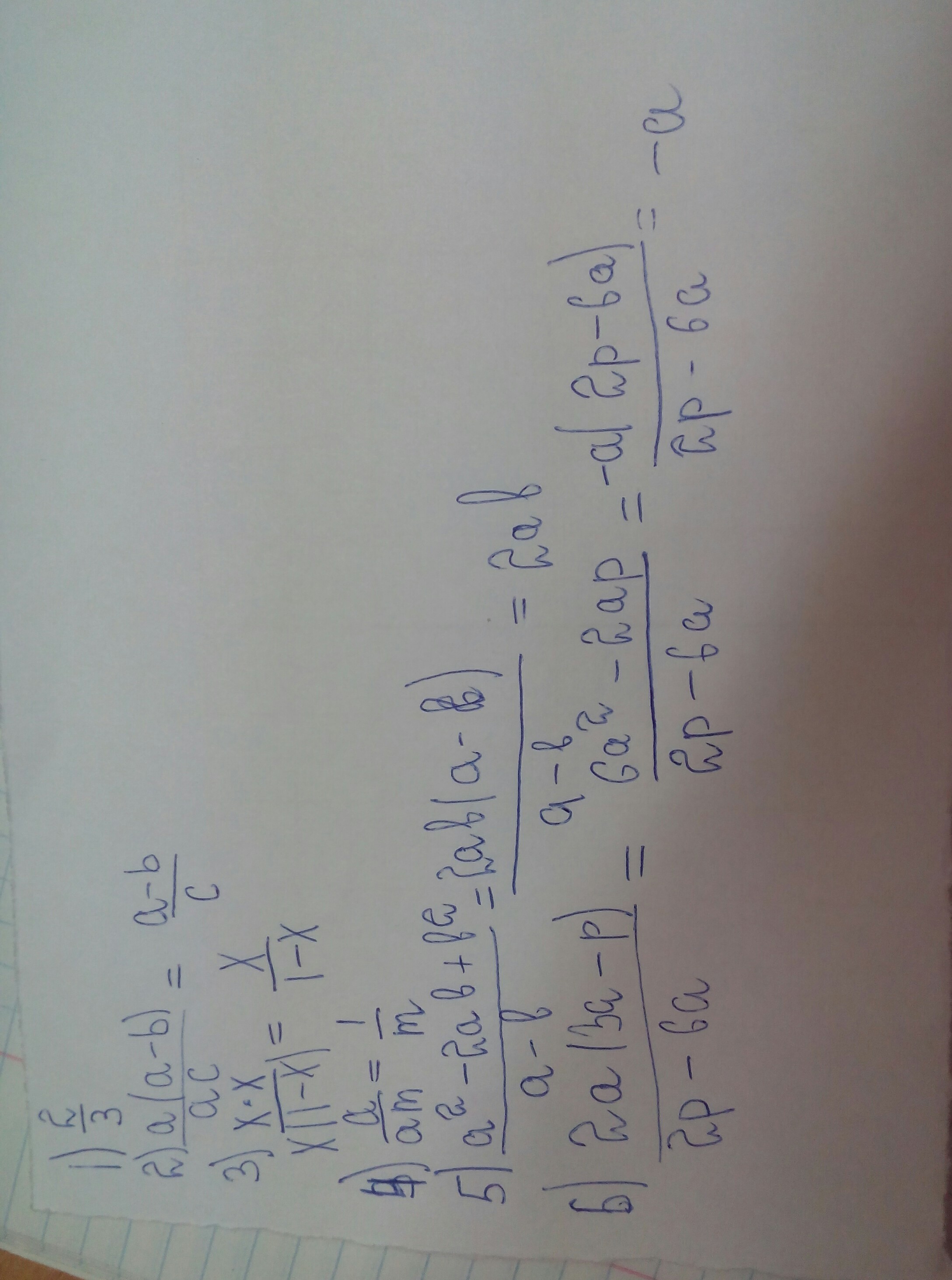 1). 2a/3a=2/3; 2). a*(a-b) / ac=(a-b) / c; 3). x^2 / x*(x-1)=x / (x-1); 4). a / am=1 / m; 5). (a-b)^2 / (a-b)=a-b; 6). -2a*(p-3a) / 2*(p-3a)= -a.