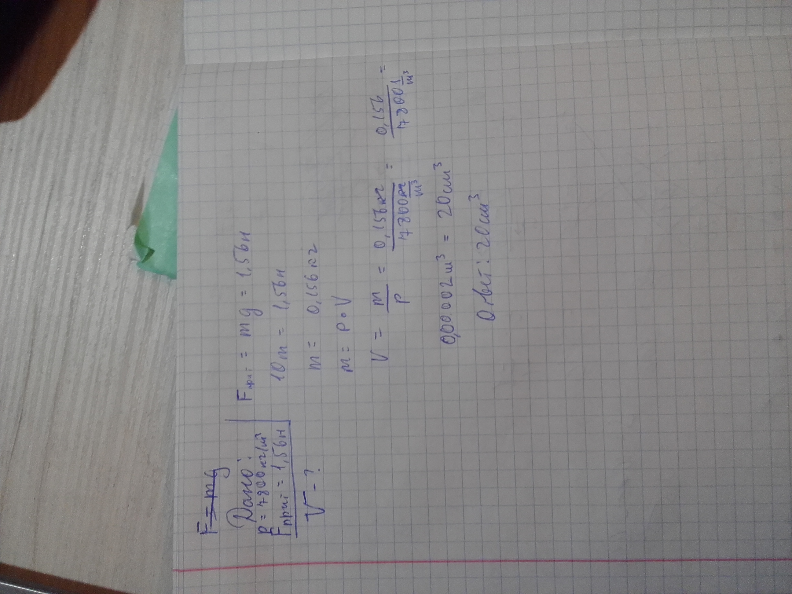 Брат, прости, что не на украинском(я из России просто). В данной задаче сила притяжения равна F = mg, выражаем массу из этой формулы и находим ее. Затем находим объем через массу и плотность(плотность смотри в справочных материалах). Переводить из метров кубических в сантиметры кубические, я думаю, необязательно. Задача рассчитана на 7 класс, если я не ошибаюсь.