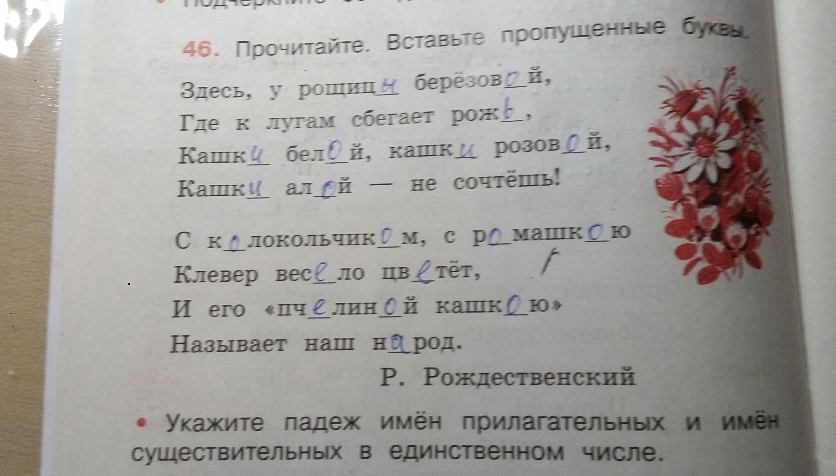 Укажите падеж имён прилагательных и имён существительных в единственном числе.