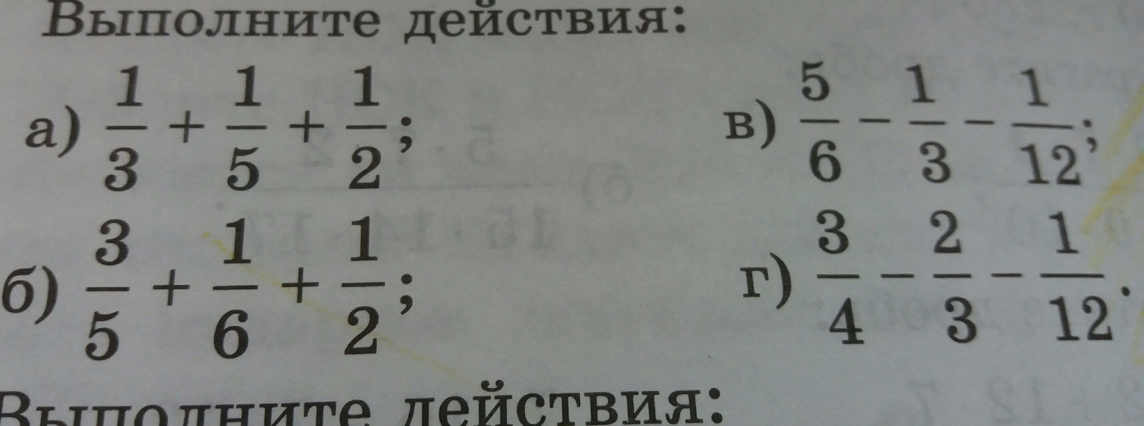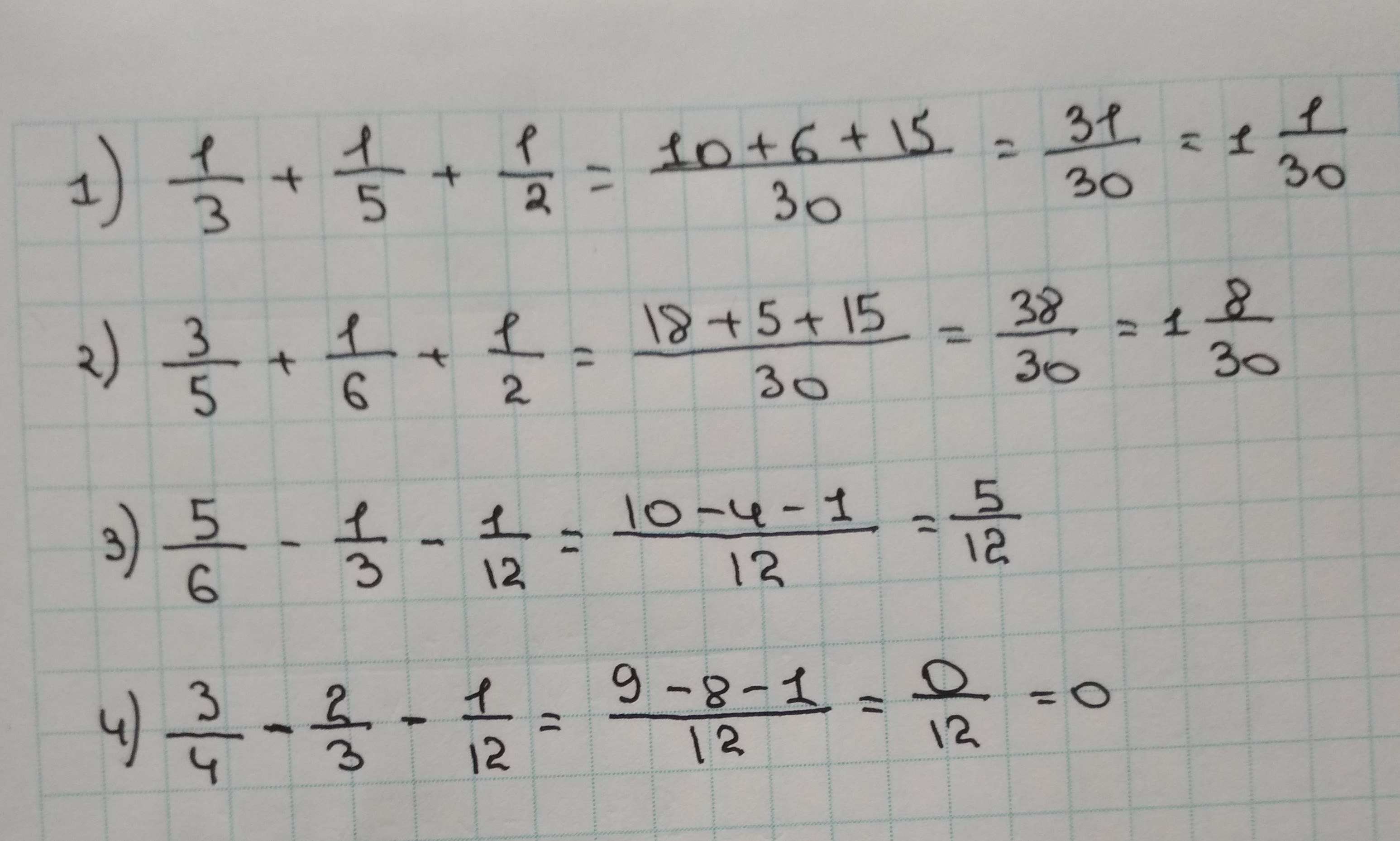 1/3+1/5+1/2=3/10 3/5+1/6+1/2=5/11 5/6-1/3-1/12= 3/3 3/4-2/3-1/12=0/6