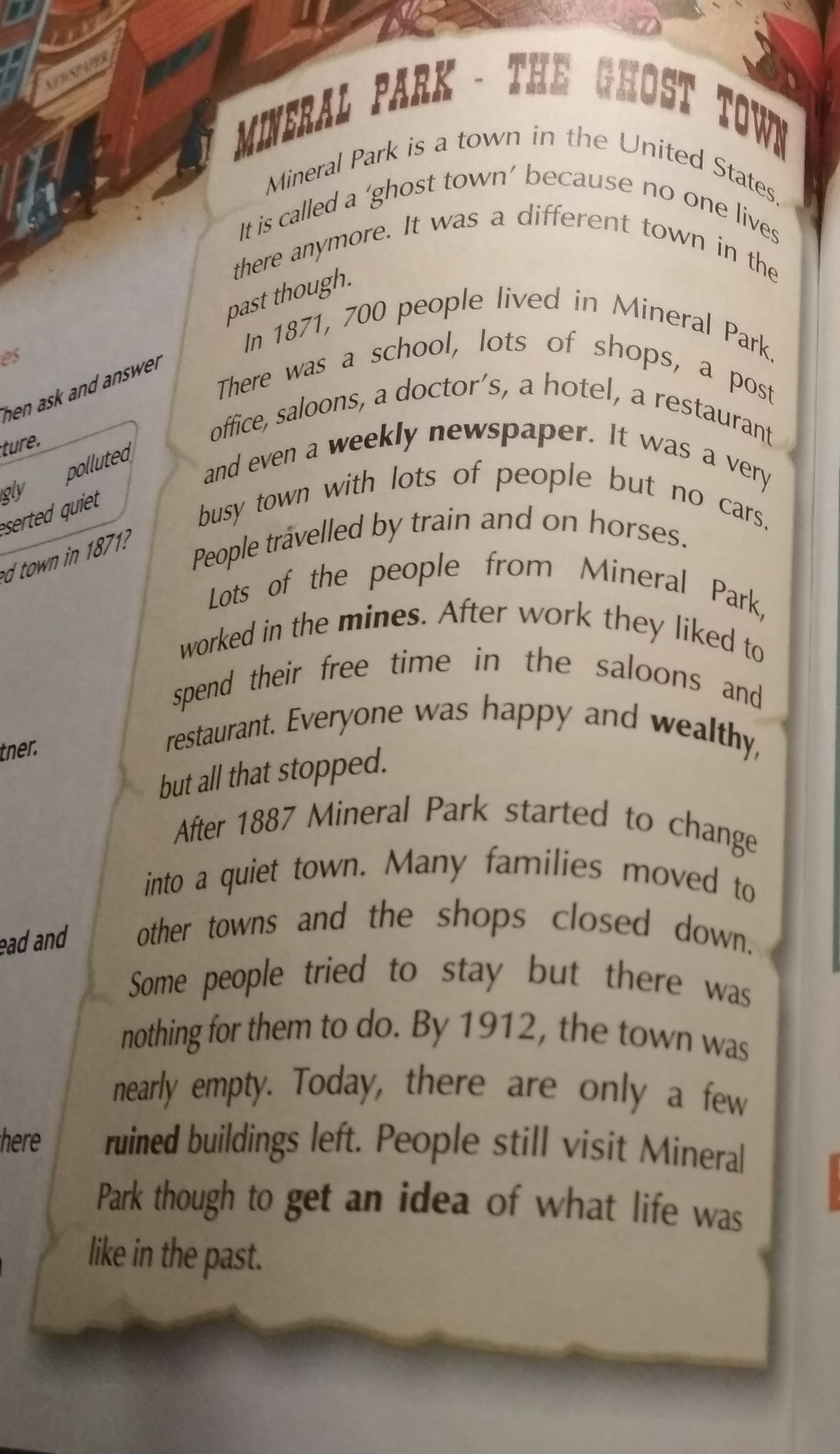 минерал парк это город в США. Он называется "город призрак" потому, что в нем никто больше не живет. В прошлом это был совершенно другой город. В 1871 году в Минерал Парк жили 700 человек. Там была школа , много магазинов, почта, салун, доктор, гостиница, ресторан и даже еженедельная газета. Это был очень занятый город с большим количеством людей, но без машин. Люди путешествовали поездом и на лошадях. Много людей из минерал Парка работали в шахтах. После работы они любили проводить свое время в салуне или ресторане. Все были счастливы и имели достаток, но потом все прекратилось. После 1887 года минерал парк стал превращаться в тихий городок. Много семей уехали в другие города и магазины позакрывались. Некоторые люди все таки пытались остаться, но им нечего было делать. К 1912 году город практически опустел. Сегодня там осталось всего несколько разрушенных зданий. Люди до сих пор еще посещают минерал парк, чтобы увидеть как жили в прошлом.