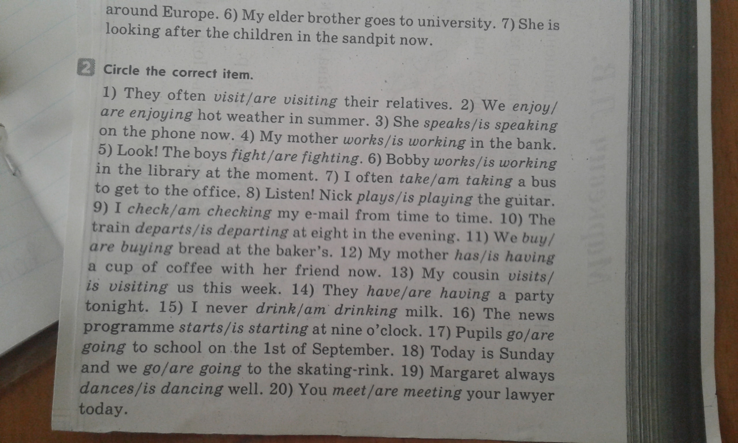 visit, enjoy, is speaking, works, are flighting, is working, take, is playing, check, departs, buy, is having, is visiting, are having, drink, starts, go, are going, dances, are meeting