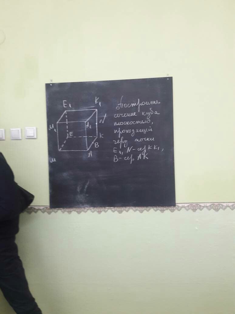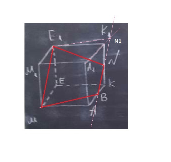 Построить сечение куба плоскостью,проходящей через точки E1, N-середина KK1, B-середина AK. Нужно само построение, и решение.