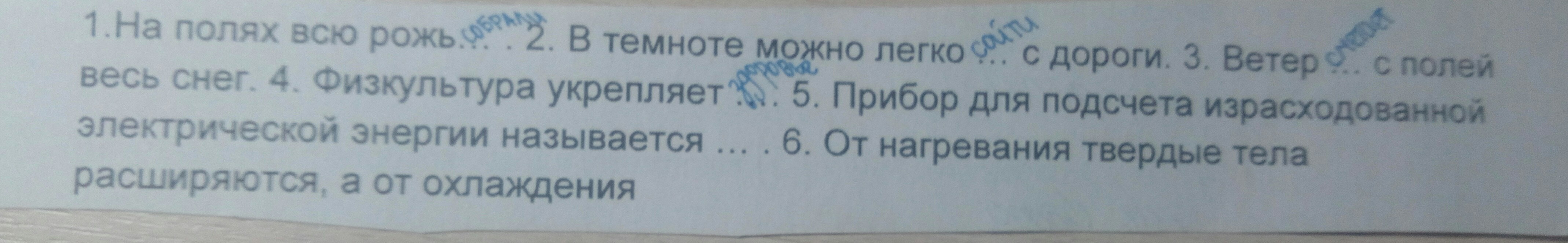 На полях всю рожь убрали.В темноте можно легко сбиться с дороги.Ветер сдувает с полей весь снег. Физкультура укрепляет выносливость. Прибор для подсчёта израсходованной электрической энергии называется счётчиком.От нагревания твёрдые тела расширяются,а от охлаждения сужаются.