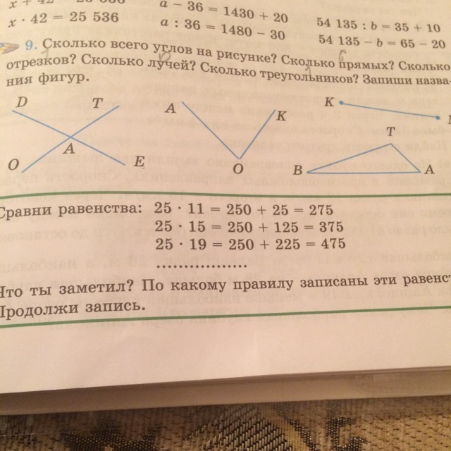 Сколько всего углов на рисунке? Сколько прямых? Сколько отрезков? Сколько лучей? Сколько треугольников? Запиши названия фигур.
