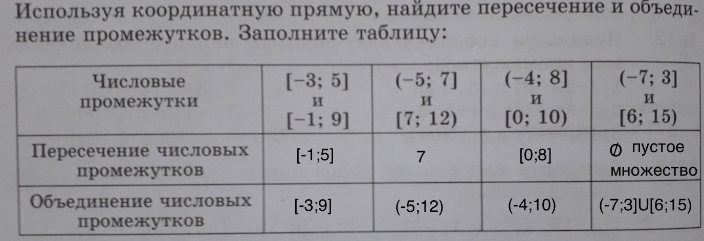 используя координатную прямую ,найдите пересечение и объединение промежутков.Заполните таблицу [-3;5] и [-1;9], (-5;7] и [7;12),(-4;8] и [0;10),(-7;3] и [6;15)