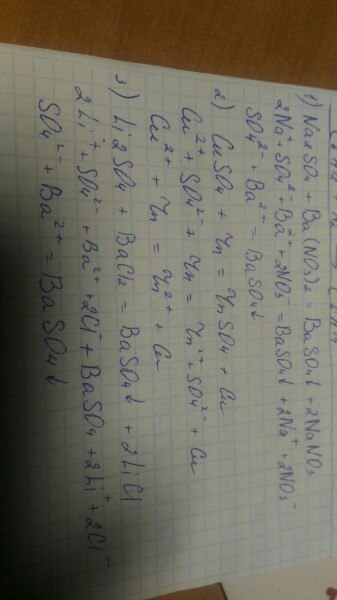 Выполните полные и краткие ионные уравнения : 1) Na2SO4 + Ba (NO3)2 => 2) CuSO4 +Zn => 3)Li2SO4 +BaCl2=> 4)ZnSO4 + H3PO4=> 5)Bi2(SO4)3 + NaOH =>