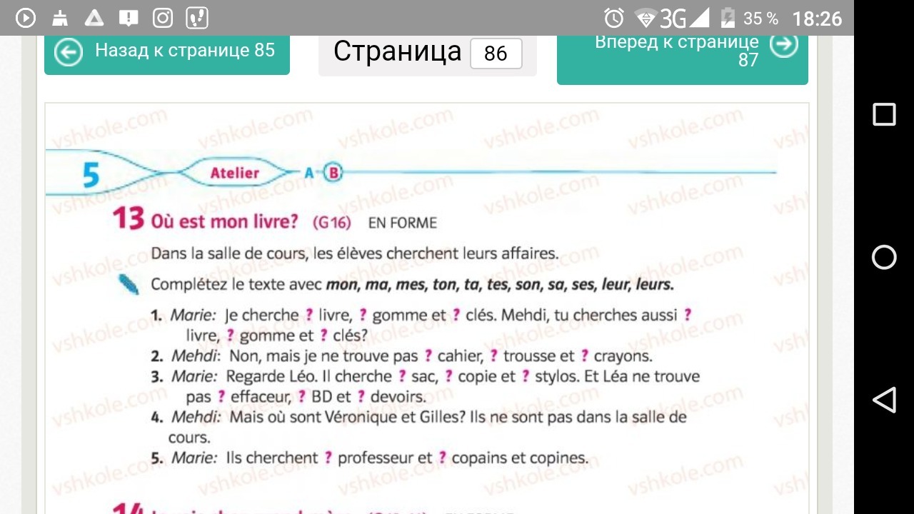 Marie: son sac, sa copie, ses stylos, son effaceur, sa BD, ses devoirs