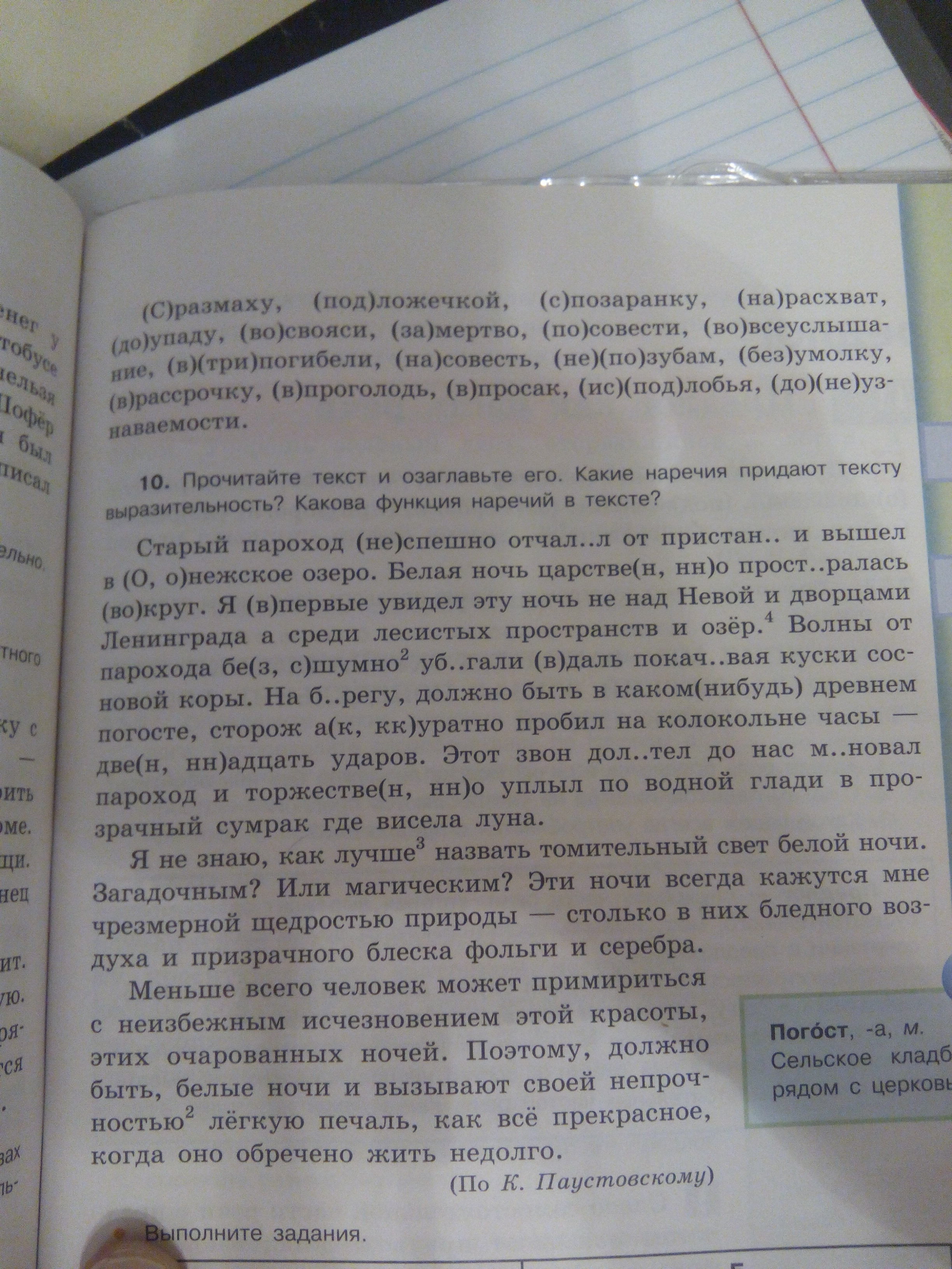 Старый пароход неспешно (как? можно заменить синонимом "медленно") отчалил от пристани и вышел в Онежское озеро. Белая ночь царственно (нар. образовано от прил. "царственный") простиралась (корень "Стир", т.к. есть суффикс "а") вокруг. Я впервые увидел эту ночь не над Невой и дворцами Ленинграда, а среди лесистых пространств и озёр (противопоставление с союзом "а"). Волны от парохода бесшумно убегали вдаль, покачивая куски сосновой коры (дееприч. всегда выделяется запятыми). На берегу, должно быть в каком-нибудь древнем погосте, сторож аккуратно пробил на колокольные часы - двенадцать ударов. Этот звон долетел до нас , миновал пароход и торжественно уплыл по водной глади в прозрачный сумрак, где висела луна.