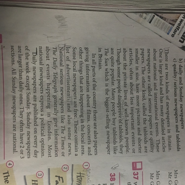 В Британии есть два типа газет. Первые ("газеты высокого качества") - это большие и с очень подробными статьями о национальных и международных событиях. Вторые ("таблоиды") - небольшого размера, но имеют много картинок и коротких статей, чаще всего пишут о наименее важных событиях или о жизни определённых лиц. The Sun - самая известная газета (таблоид).