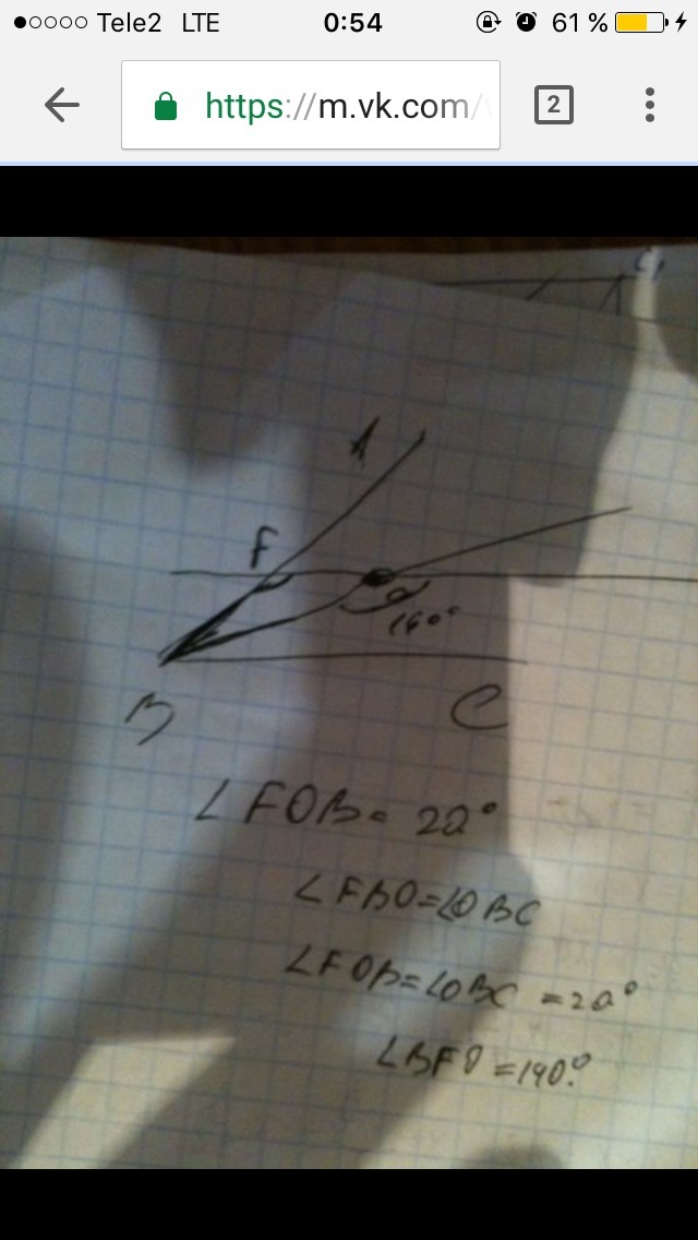Через точку О биссектрисы угла АВС проведена прямая, параллельная прямой ВС и пересекающая луч ВА в точке F. Вычислите градусные меры углов треугольника BFО,если градусная мера угла,смежного с углом FOB,равна 160° прошу очень надо! 100 баллов