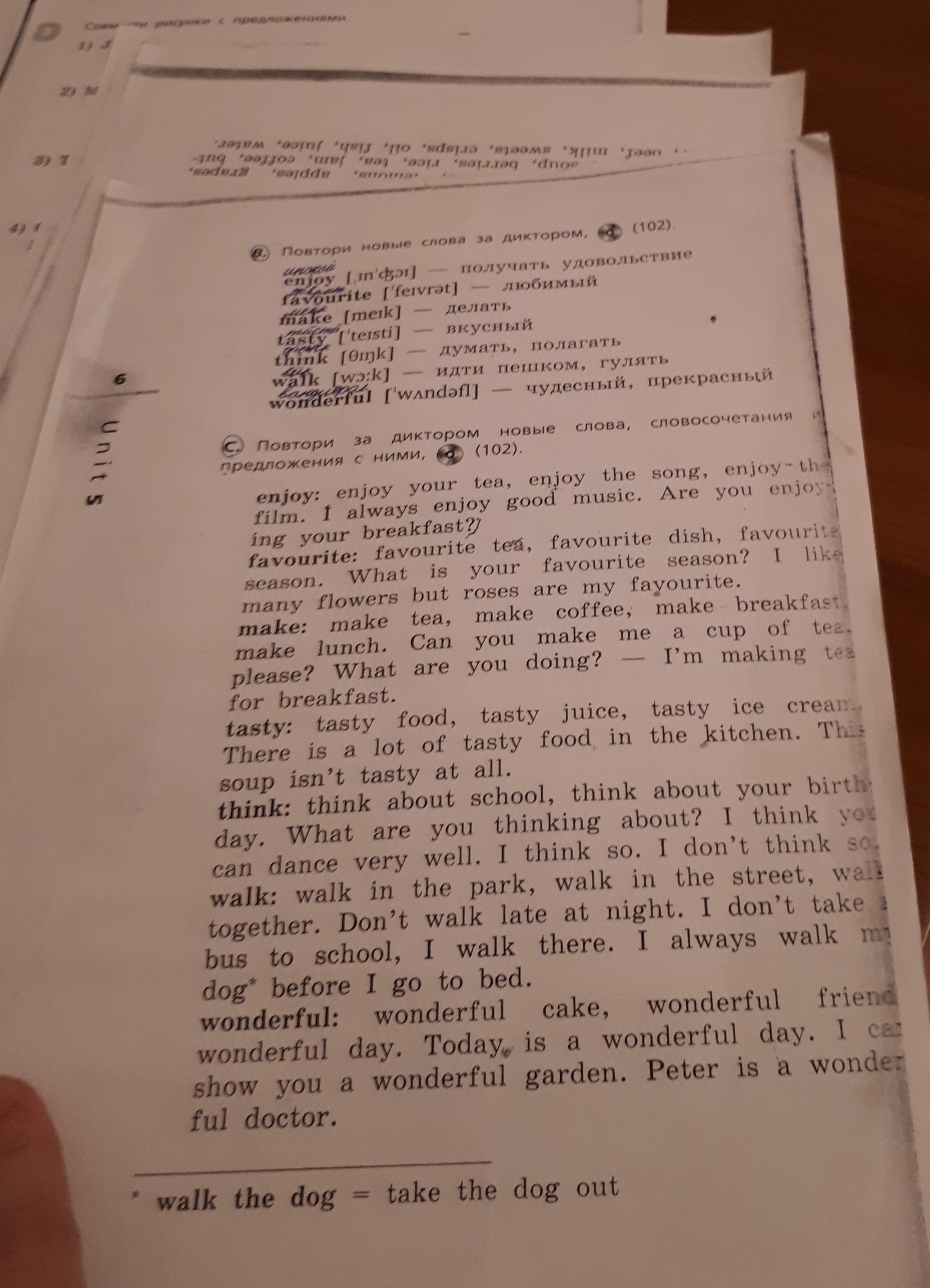 наслаждайтесь чаем, наслаждайтесь песней, наслаждайтесь фильмом. 1 всегда наслаждайтесь музыкой Atood. Вы enjo: любимый чай faRtzy favouriter. любимый дина, любимый сезон. Какое твое любимое время года? 1 lik много цветов, но розы - мой фаюрит. приготовление чая, приготовление кофе, приготовление завтрака. Вы можете сделать мне чашку чая? Что делаешь? Я делаю на завтрак. сок вкусный вкус льда вкусный: вкусная еда, вкусная На кухне много вкусной еды. Th soup совсем не вкусный. birt думаю: подумайте о школе, подумайте о своем дне. О чем ты думаешь? Я думаю, что можно очень хорошо танцевать. Я думаю так. Я не думаю, что хожу: прогуляйтесь по парку, идите на улицу, вместе. Не ходите поздно ночью. Я не еду в школу, я туда иду. Я всегда гуляю с собакой », прежде чем я ложись спать. Замечательный чудесный сюрприз: замечательный торт, чудесный день. Сегодня замечательный день. Я показываю вам чудесный сад. Питер - очень опытный доктор.