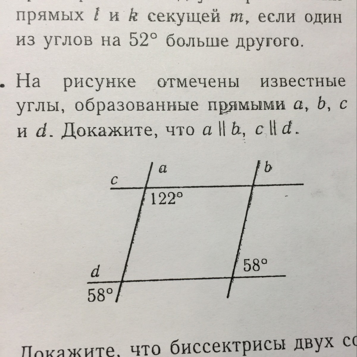 Так как угол 4=58° и угол 1=58° (соответственные ), то a параллельно b по 2 признаку параллельности прямых.