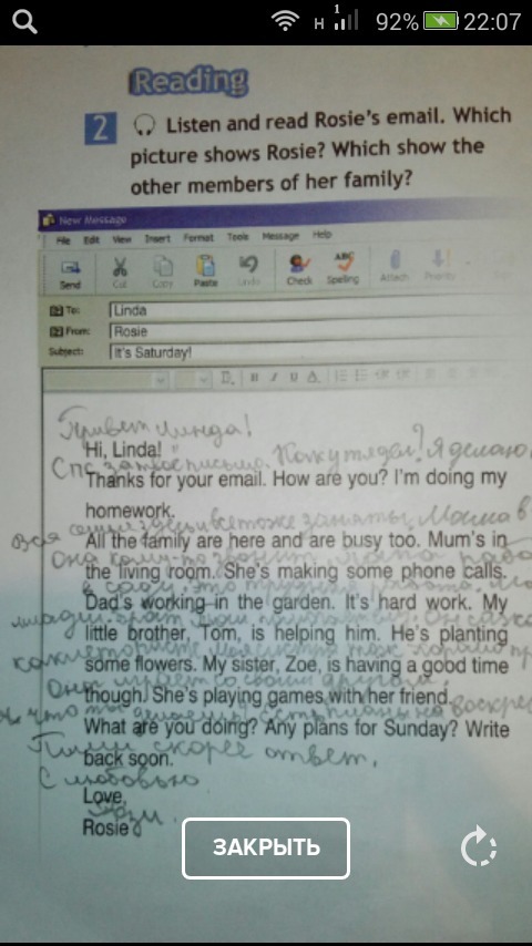 Вся семья здесь и все тоже заняты.Мама в зале(может неверно),она кому то звонит.Папа работает в саду,это трудная работа.Мой маленький брат,Том,помогает ему.Он(не поняла) какие то(не поняла).Моя сестра Зоя тоже хорошо(не поняла).Она играет со своим другом.Что ты делаешь?Есть планы на воскресенье?
