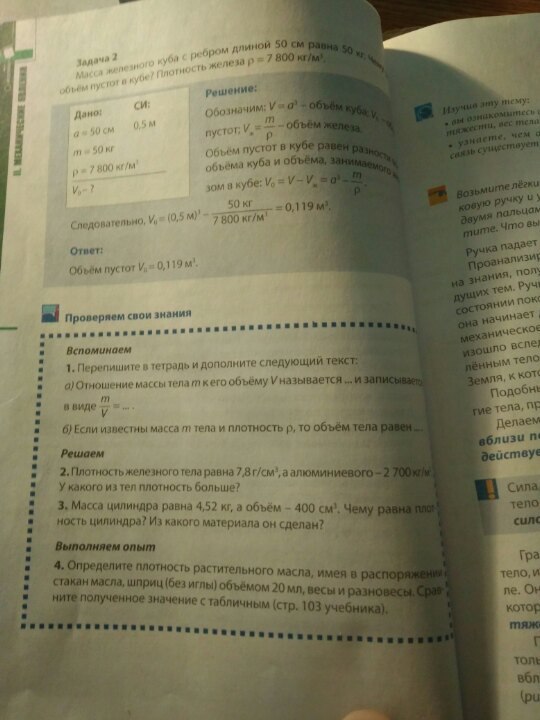 отношение массы тела к его объему называется плотностью ρ и записывается в виде формулы m/V=ρ. Если известны масса тела и плотность, то объем тела равен плотность умноженная на массу V=ρ*m