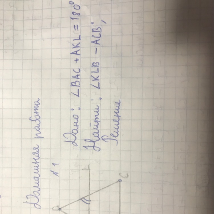 Помогите пожалуйста решить задачу по геометрии. Дано: угол BAC + угол AKL=180 градусов. Найти