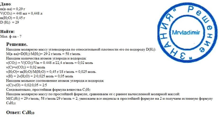 При сжигании 0.29 г газообразного углеводорода получили 448 мл СО2 и 0.45 паров воды. Относительная плотность по водороду 29. Найти формулу