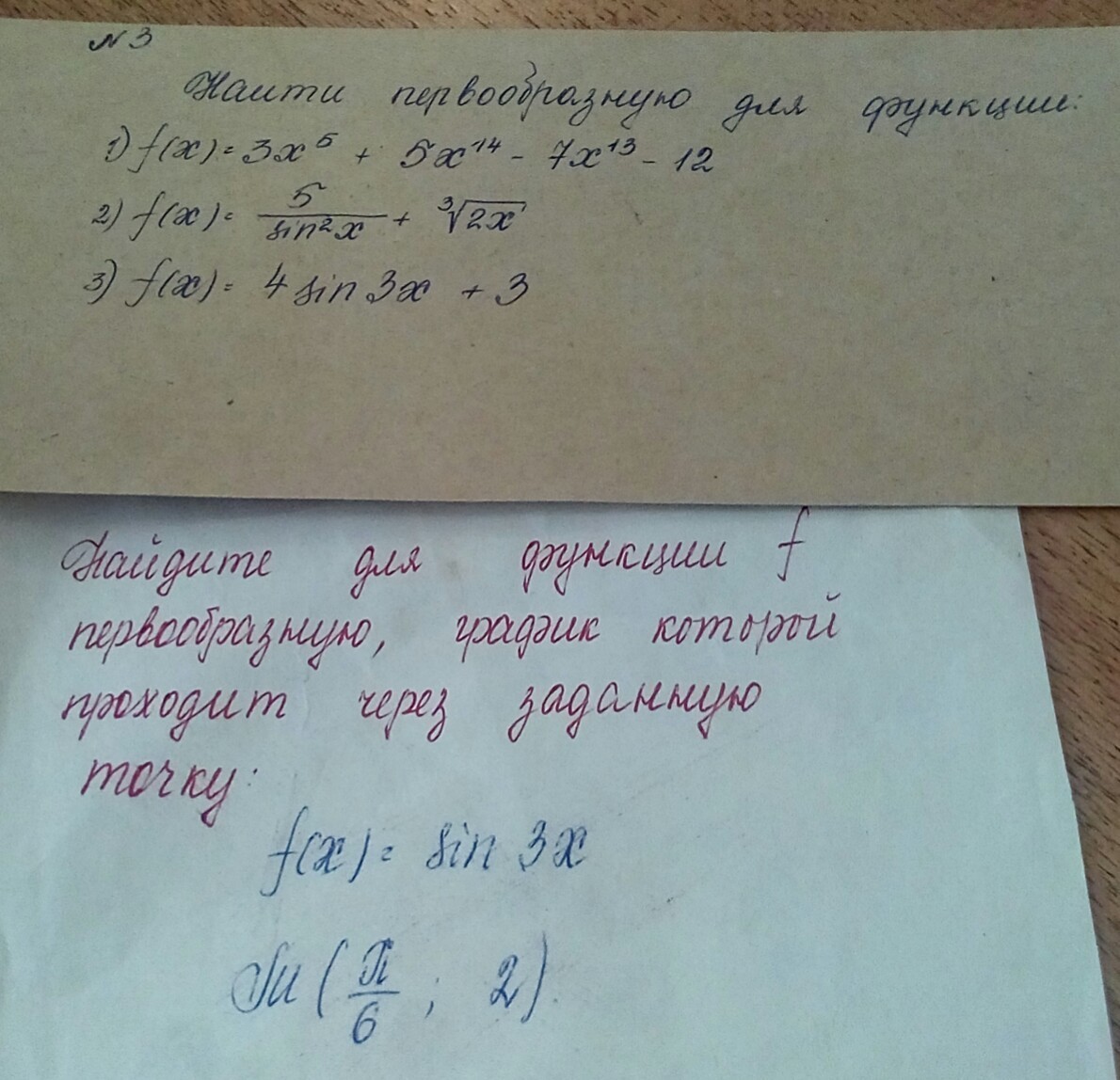 3) F(x)=4/3*∫sin(3*x)*d(3*x)+3*∫dx=-4/3*cos(3*x)+3*x+C. Ответ: -4/3*cos(3*x)+3*x+C.