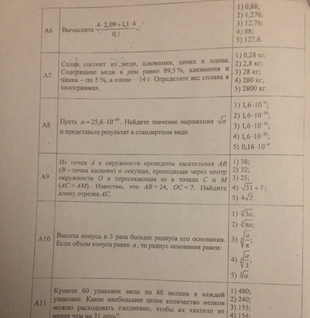 A8. 25,6*10^-19=2,56*10^-18. (2,56*10:-18)^1/2=1,6*10:-9. А 11. 80*60=4800(мелков)-всего в 60 упаковках. 2).4800:31=154,5(приблизительно). Ответ: цифра 4.