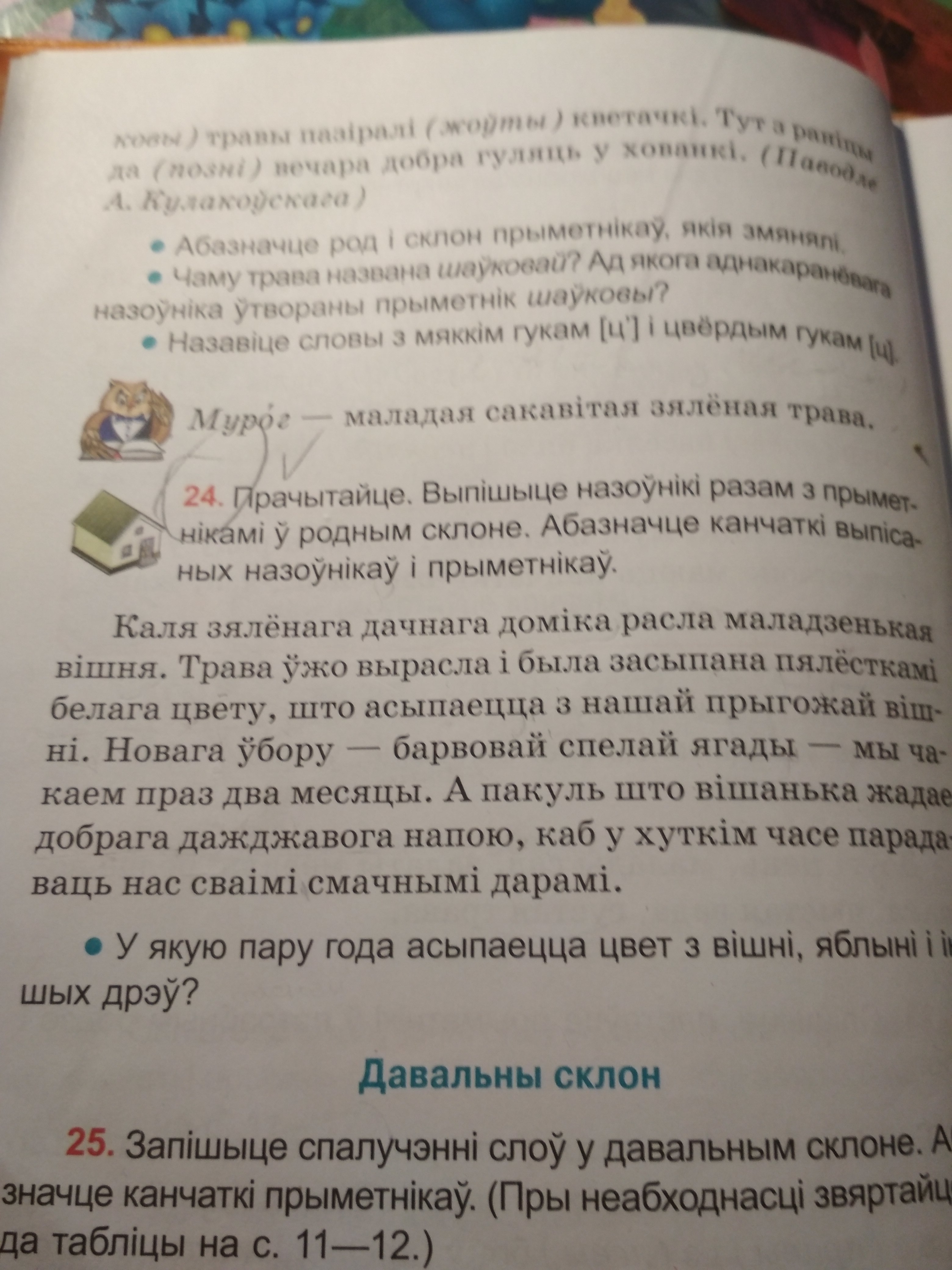 Каля домика якога? Зялёнага, дачнага. Вишни якой? Прыгожай. Ягады якой? Бяровай, спелай. Дажджавога напою .