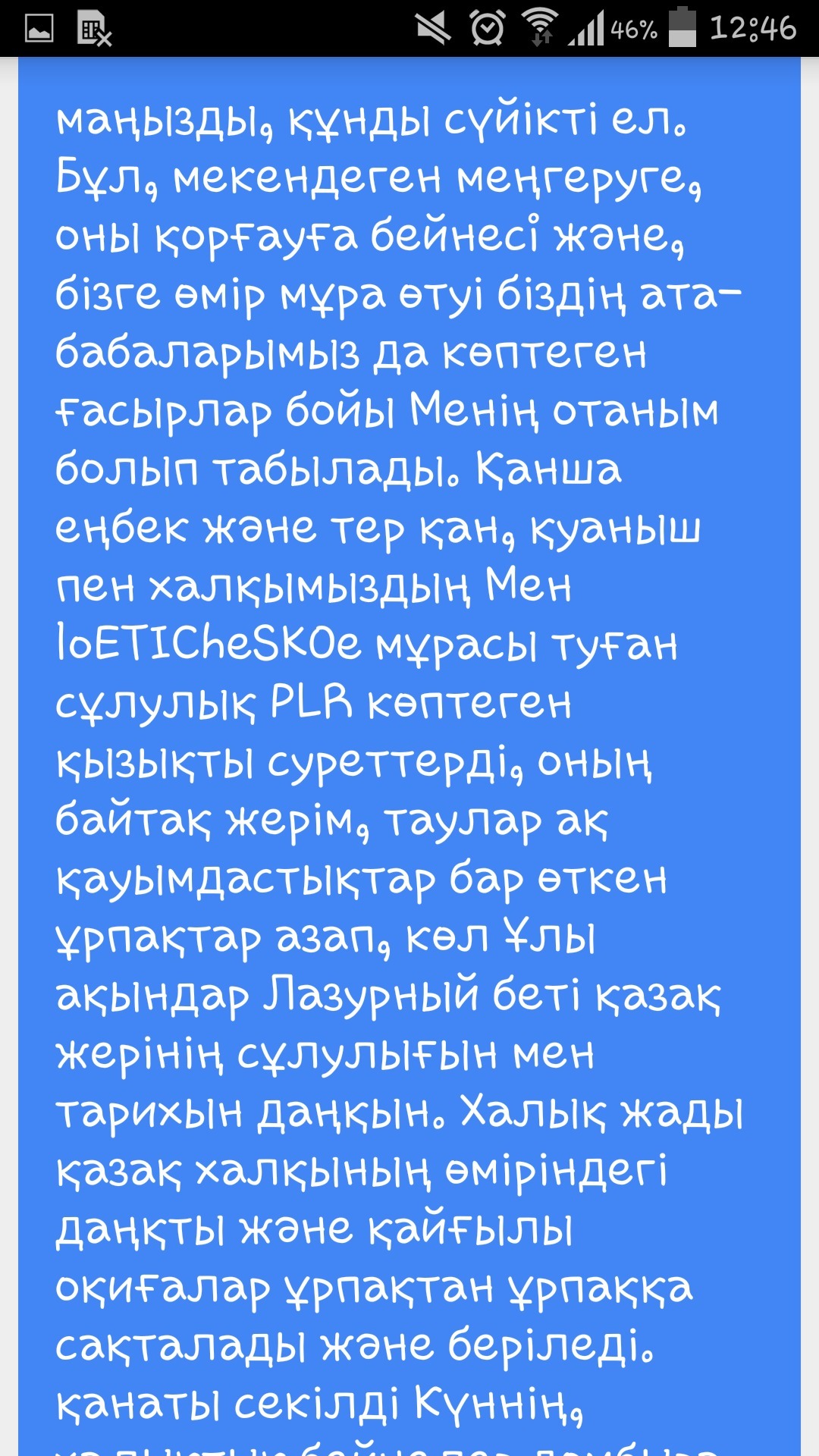Менің Отаным -Қазақстан.Оның жері кең, әрі бай.Бұл ел баршаға ортақ ,үлкен мемлекет.Біздің елде көптеген ұлт өкілдері тұрады.Олардың барлығы тату-тәтті өмір сүреді.Біздің жеріміздің асты-үсті қазынаға толы бай.Табиғатымыз сұлу ,биік-биік асқар таулар, мөлдір көлдер көп.Мен осындай кең байтақ жерімді,Отанымды сүйемін.