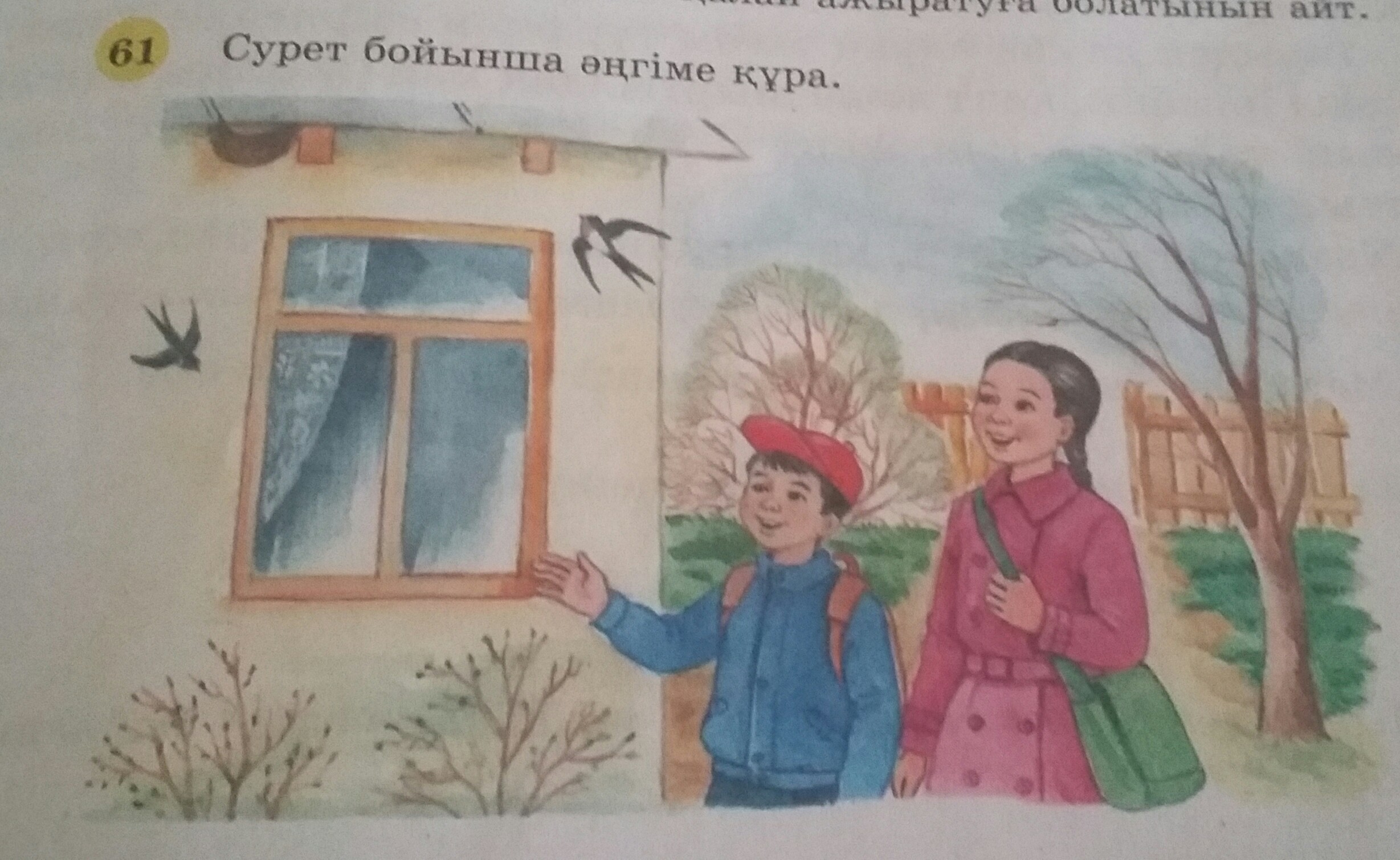 Біздің аула кең. Үлкен үй, айнала шарбақпен қоршалған. Аулада ағаштар отырғызылған. Жыл сайын көктемде қарлығаштар терезе үстіне ұя салады. Биыл да келіпті. Жанар екеуміз оларды көріп қуанып қалдық.
