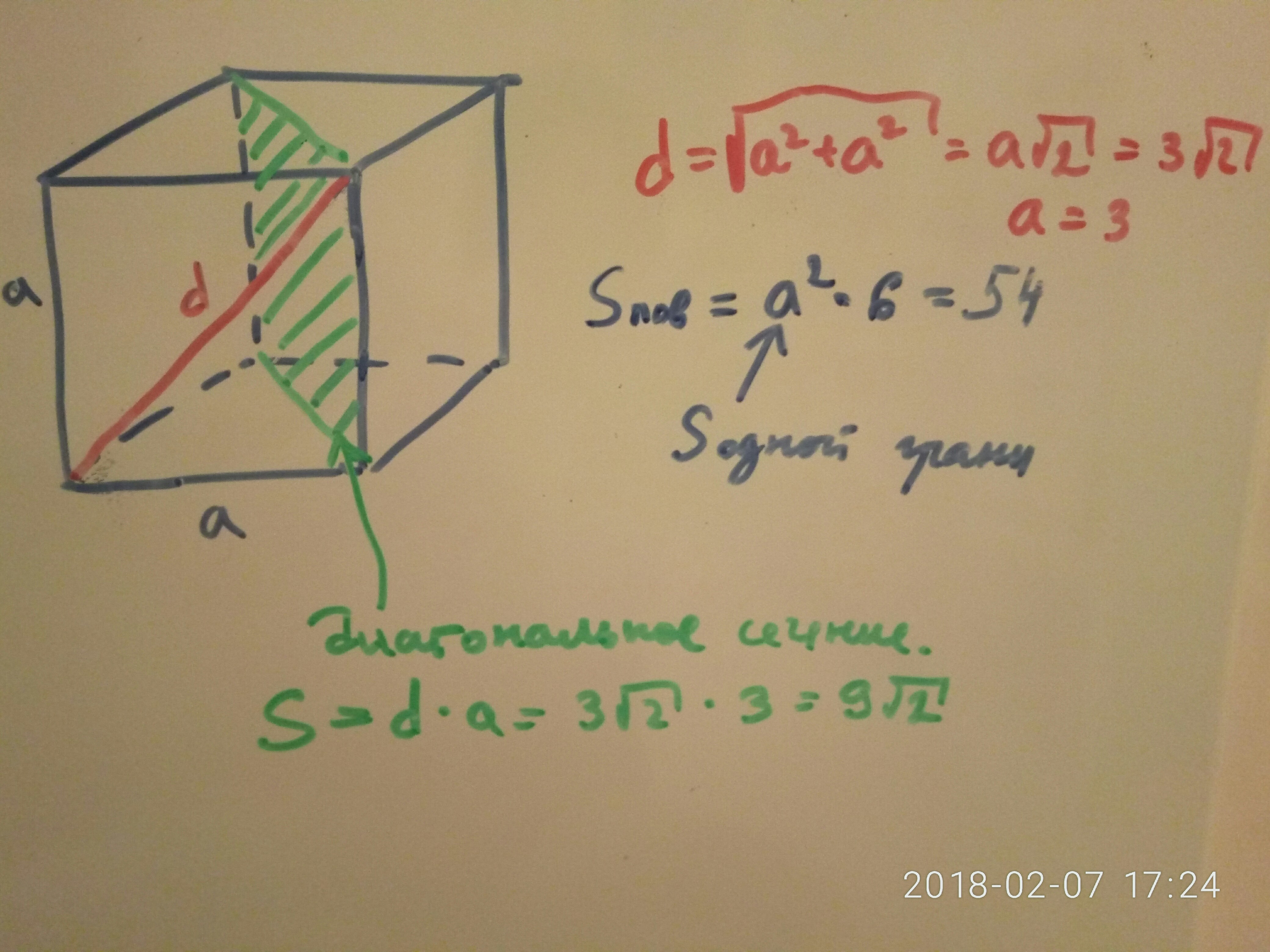 Диагональ грани куба равна 3 корень из 2. Найдите площадь полной поверхности куба, площадь диагонального сечения и сумму всех его диагоналей.