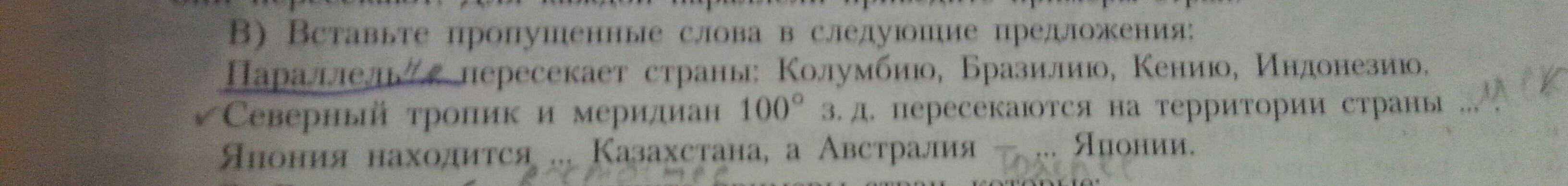 вставьте пропущенные слова слова в следующие предложения: Параллель пересекает пересекает страны: колумбию Бразилию кению Индонезию. Северный тропик и Меридиан100○ з. д. пересекаются на территории страны... . Япония находится ...Казахстан, Австралия- ...Япония