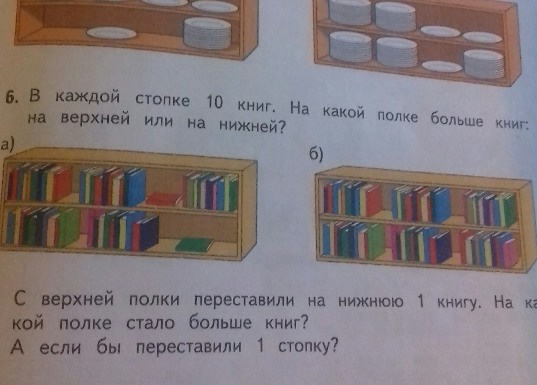 в каждой стопке 10 книг. На какой полке больше книш:на верхней или на нижней? С верхней полки переставил и на нижнюю 1 книгу. На какой полке стало больше книг?А если бы переставили 1 стопку?
