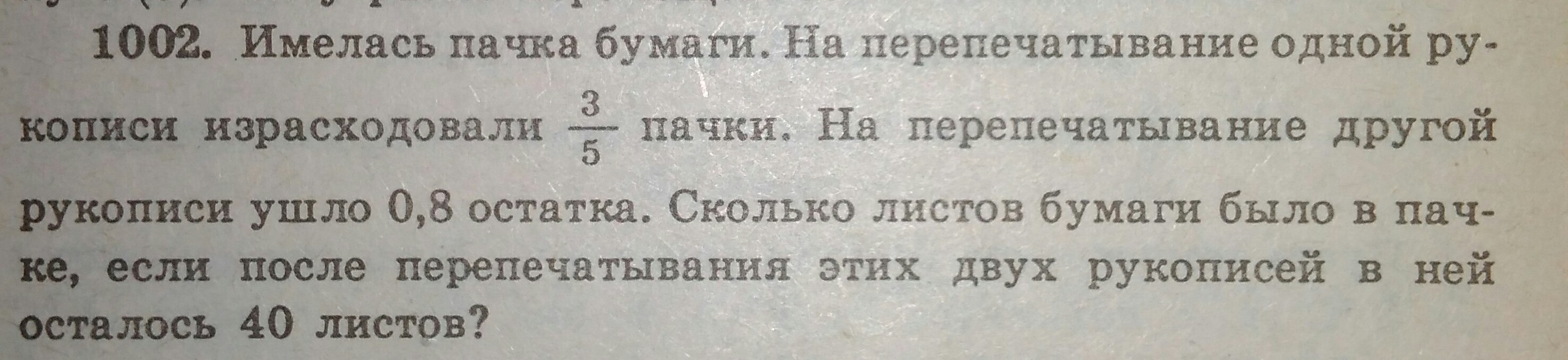 Измелась пачка бумаги.На перепечатывание одной рукописи израсходовали три пятых пачки.На перепечатывание другой рукописи ушло 0,8 остатака.Сколько листов бумаги было в пачке,если после перепечатывание этих двух рукописей а ней осталось 40листов