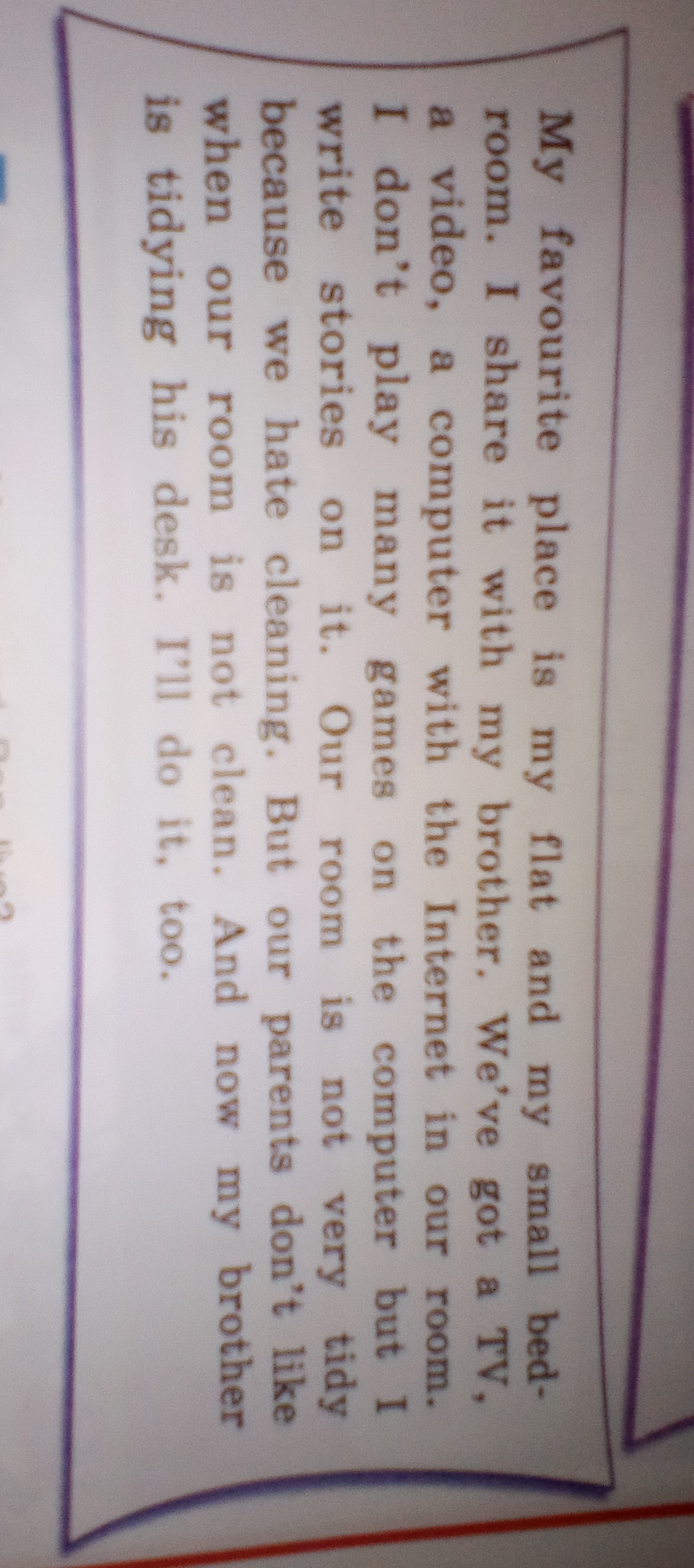 Моё любимое место это моя квартира и моя маленькая спальня.Моя доля с моим братом.У нас есть телевизор,видео,компьютер с интернетом в нашей комнате.Я не играю много в компьютерные игры на компьютере,но я пишу истории на нём.Наша комната не очень чистая,потому что мы ненавидем убираться в ней.Но наши родители не любят когда наша комната не убрана.И сейчас мой брат приводит в порядок свой стол.Я тоже это сделаю.