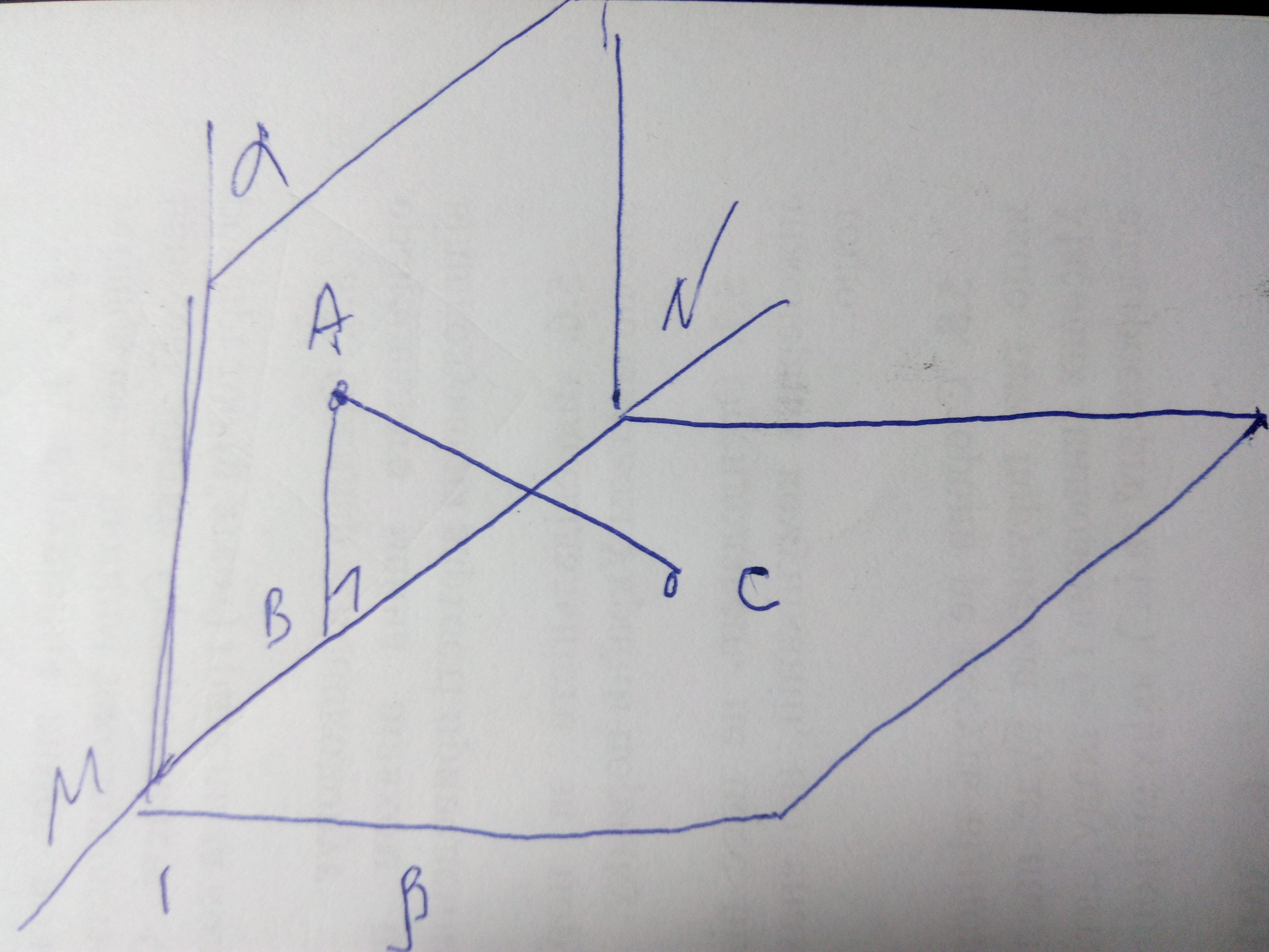 Перпендикулярные плоскости α и β пересекаются по прямой MN. В плоскости β из точки А проведен перпендикуляр АВ к прямой MN и из той же точки А проведена наклонная АС к плоскости α. Сделать рисунок. Найти на рисунке скрещивающиеся прямые.