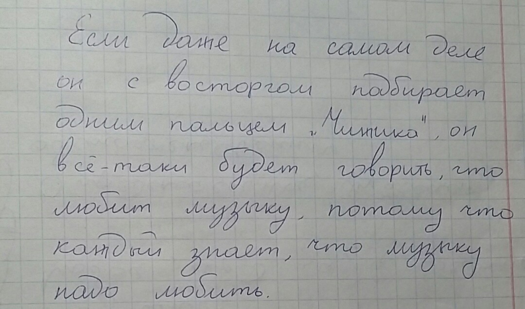 Если даже на самом деле он с восторгом подбирает одним пальцем "Чижика", он все-таки будет говорить, что любит музыку, потому что каждый знает, что музыку надо любить ( нормальный почерк, что непонятного)