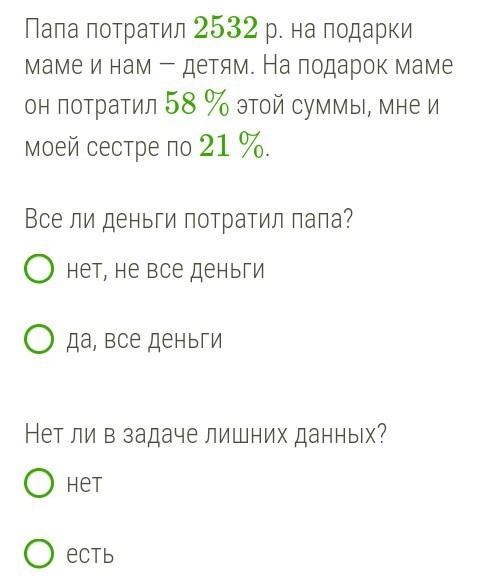 Есть лишние данные (Сколько всего потратил, потому что можно было написать 58% и 21% от затраченной суммы)