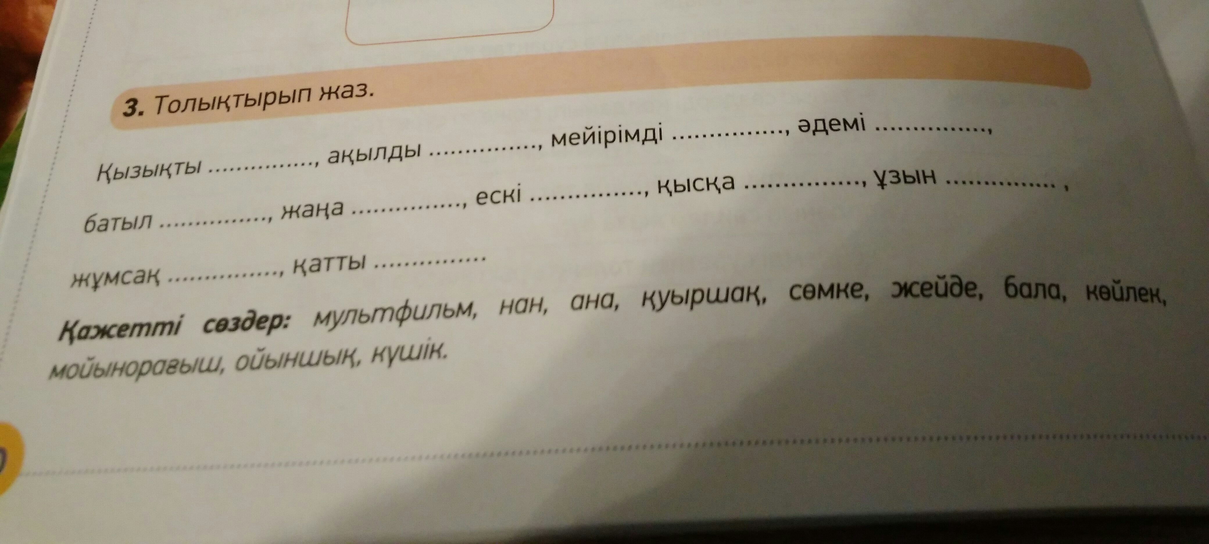 Қызықты мултьфильм, ақылды күшік ,мейірімді ана, әдемі жейде , батыл бала, жаңа сөмке, қысқа көйлек, ұзын мойынорағыш, жұмсақ нан, қатты ойыншық.