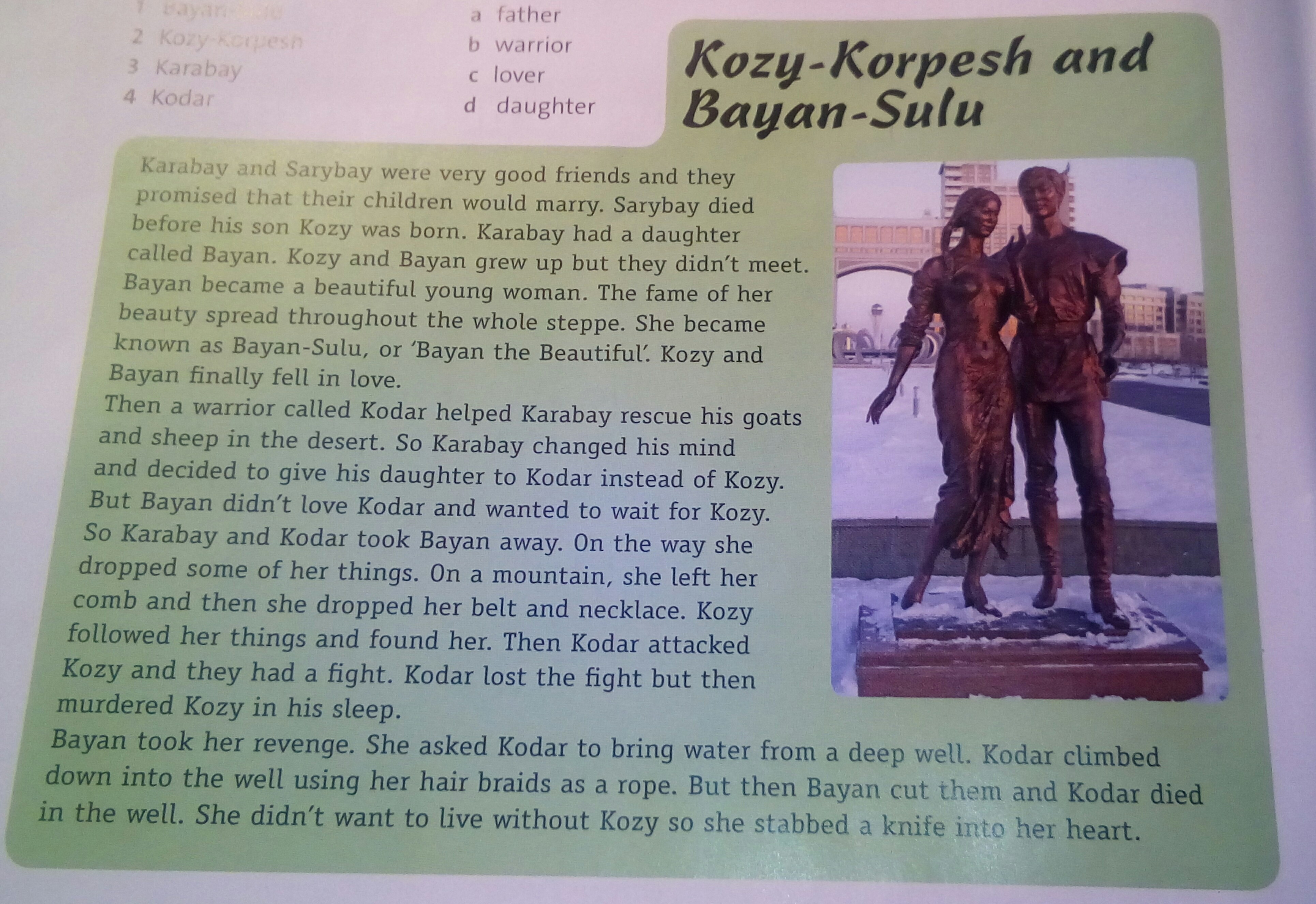 k l ay и s tray пошли очень хорошо друг и поняли, что дети женились, динил, прежде чем сын Кази был боком. У К-ратай был Дах, называемый Райан. Кори и Баян выросли, они не встретились. hayan стала красивой молодой женщиной. Приручение ее красоты распространилось по всей uevpe, она стала Jrnown, как Баян Сулу, или Баян Прекрасная. Кози и Хаян наконец влюбились. Затем воин по имени Кодур помог Кааабайу спасти своих козлов и овец в пустыне. Итак, Карабай изменил и решил отдать своего товарища Кодару вместо Кози. Баян не сбил Коду и хотел подождать Кори. поэтому Карабад и Кодар убрали Баяна. по дороге сбросил некоторые из ее вещей. О, она оставила hea corrib, а затем она уронила свой пояс и ожерелье. Кози следовала за ее вещами и нашла ее. Затем Кодар набросился на Кози, и они напряглись. Кодар потерял плотно, но потом убил Кози во сне. Баян отомстил, она попросила Кодара принести воду с глубокого приветствия. Кодар поднялся на дову в колодец, используя свои косы волос в качестве веревки. Но затем в колоде погибла баянская кроватка и Кодат. Она не хотела жить без Кори, поэтому она ударила ножом в сердце.