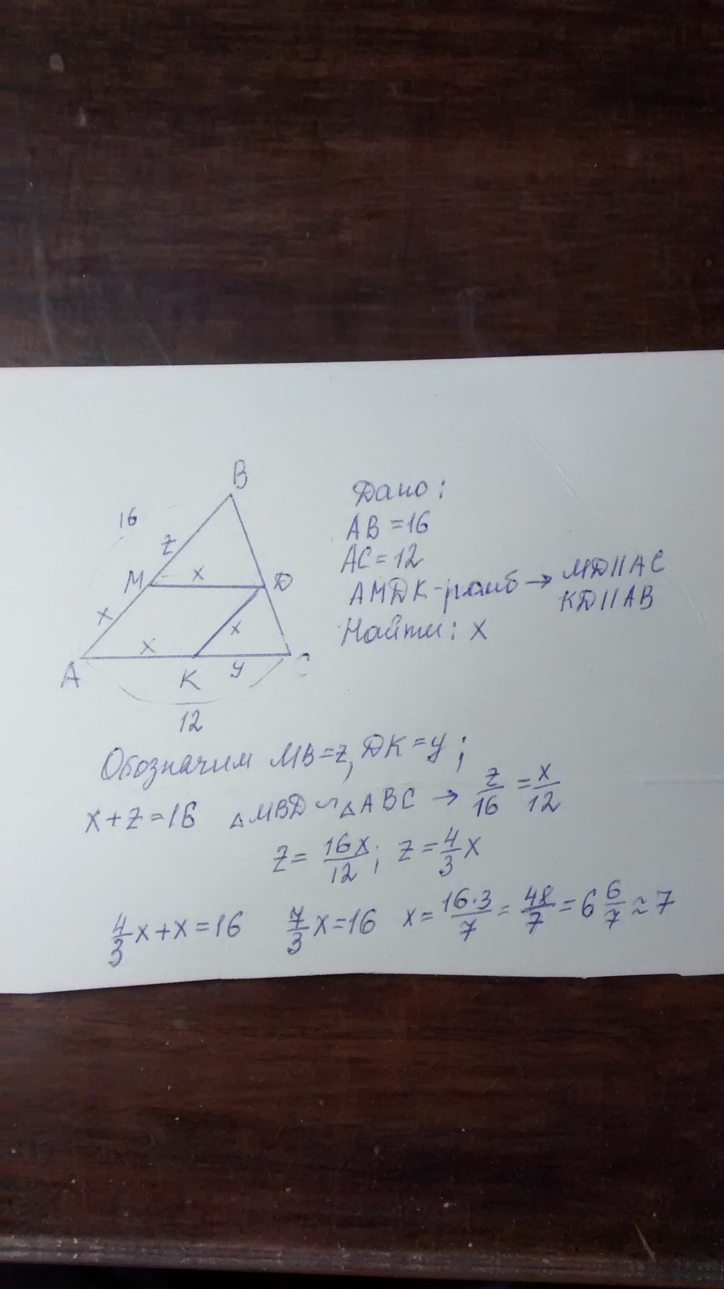 У трикутник ABC вписано ромб AMDK так що кут A в них спільний, а вершини D належить стороні BC. Знайдіть сторону ромба, якщо AB=16см, AC=12см