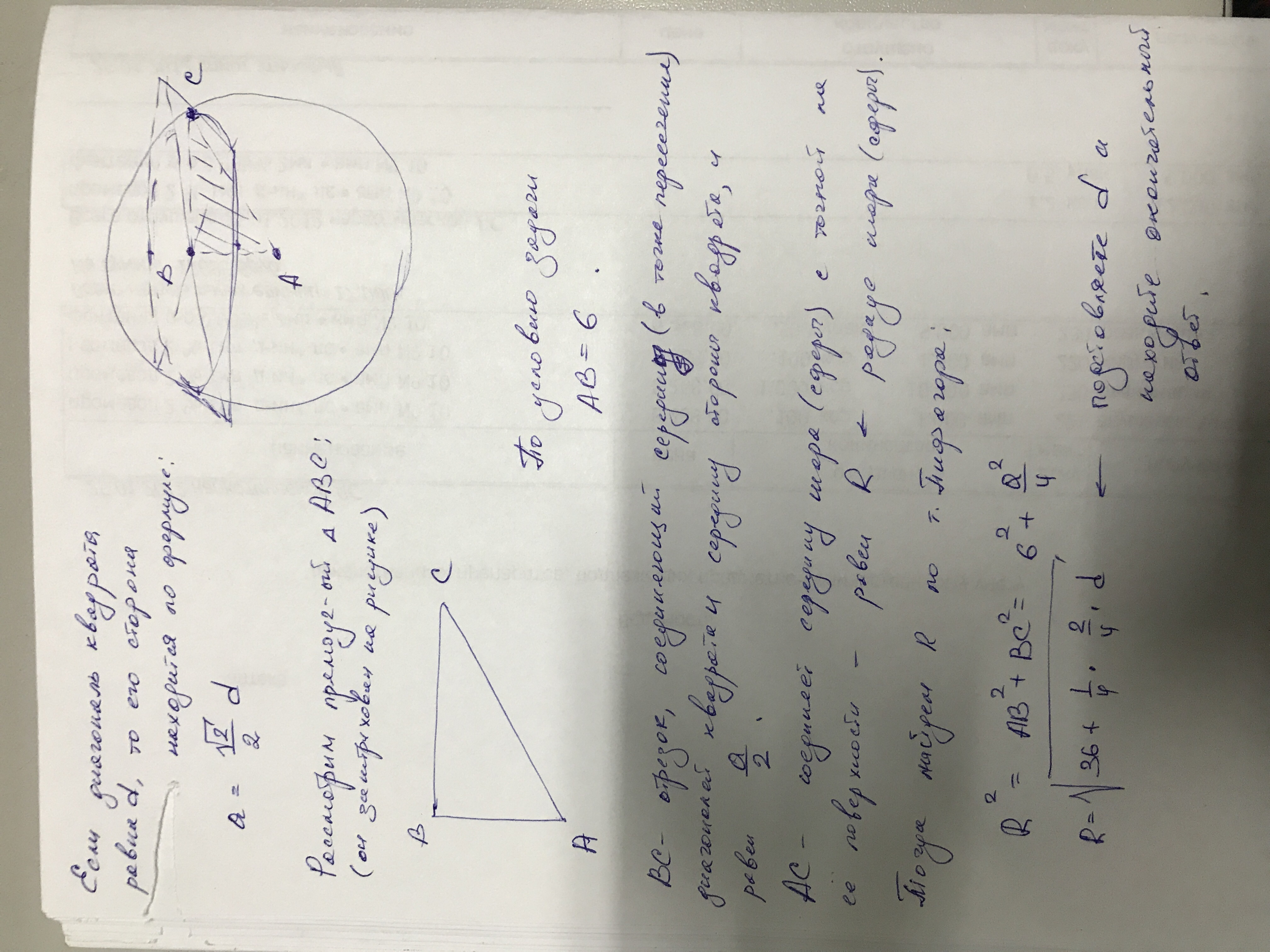 Все стороны квадрата касаются сферы. Диагональ квадрата равна . Найдите радиус сферы, если расстояние от центра сферы до плоскости квадрата равно 6.