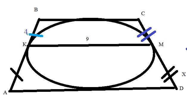 // 9*2 = 4*2 + x*2 (тк окружность можно вписать в трапецию) // тогда 10 = 2*x // x = 5 Ответ: 5.