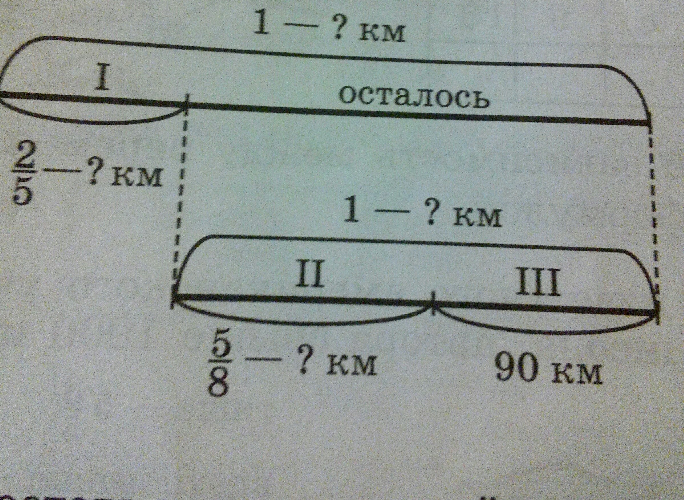 Ледокол 3 дня пробивал себе путь во льдах.В превый день он проплыл-2/5,всего пути,во второй день-5/8,оставшегося пути,а в третий день оставшиеся 90 км.Какой путьпроплыл ледокол за 3 дня пути?Сколько километров он проплыл в первый и во второй день?