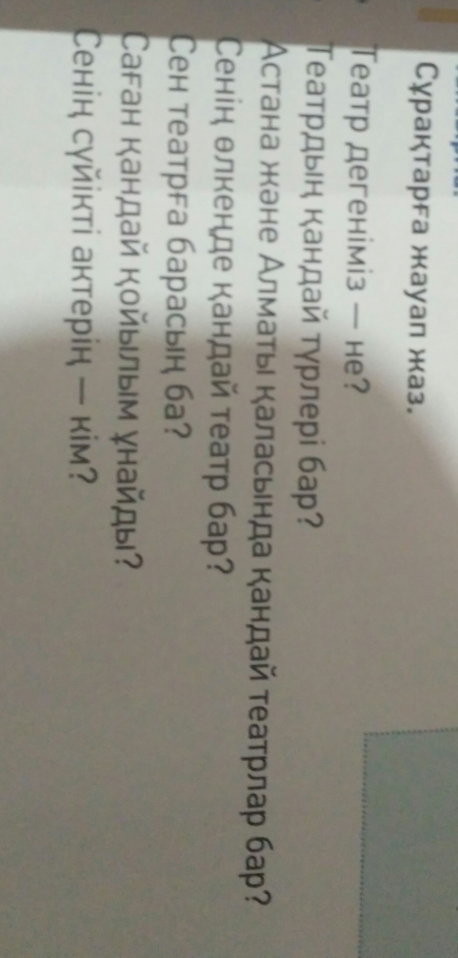 1. Театр дегеніміз адамдардың, актерлардың немесе әншілердің спетакль құруын айтамыз.