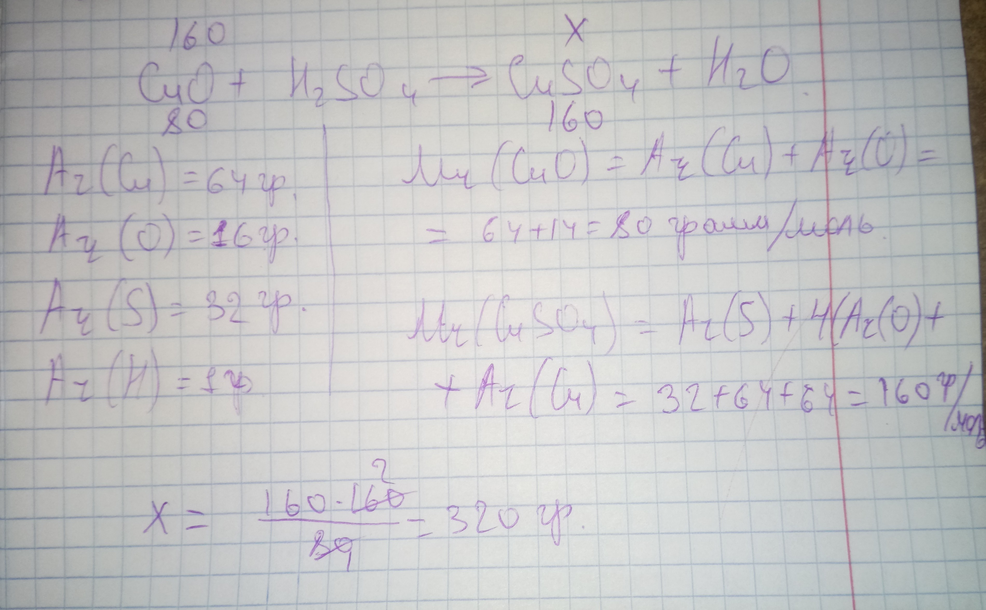 Пишем реакцию, пишем снизу молекулярную массу СuO , а сверху сколько дано , под CuSO4 пишем молекулярную массу , а над ним Х .