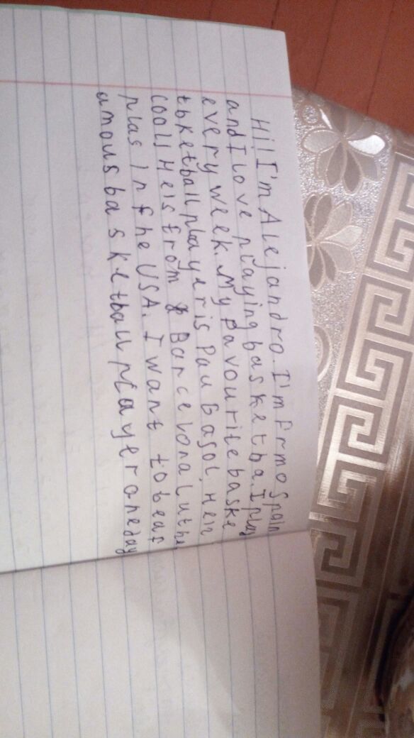 Здравствуйте! Меня зовут Аледжандро. Я живу в Испании и я люблю играть в баскетбол. Я играю в баскетбол каждую неделю. Мой любимый баскетбольный игрок Пау Басот. Он очень клевый! Он живет в Барселоне, но играет он в США. Когда-нибудь я стану знаменитым игроком в баскетбол