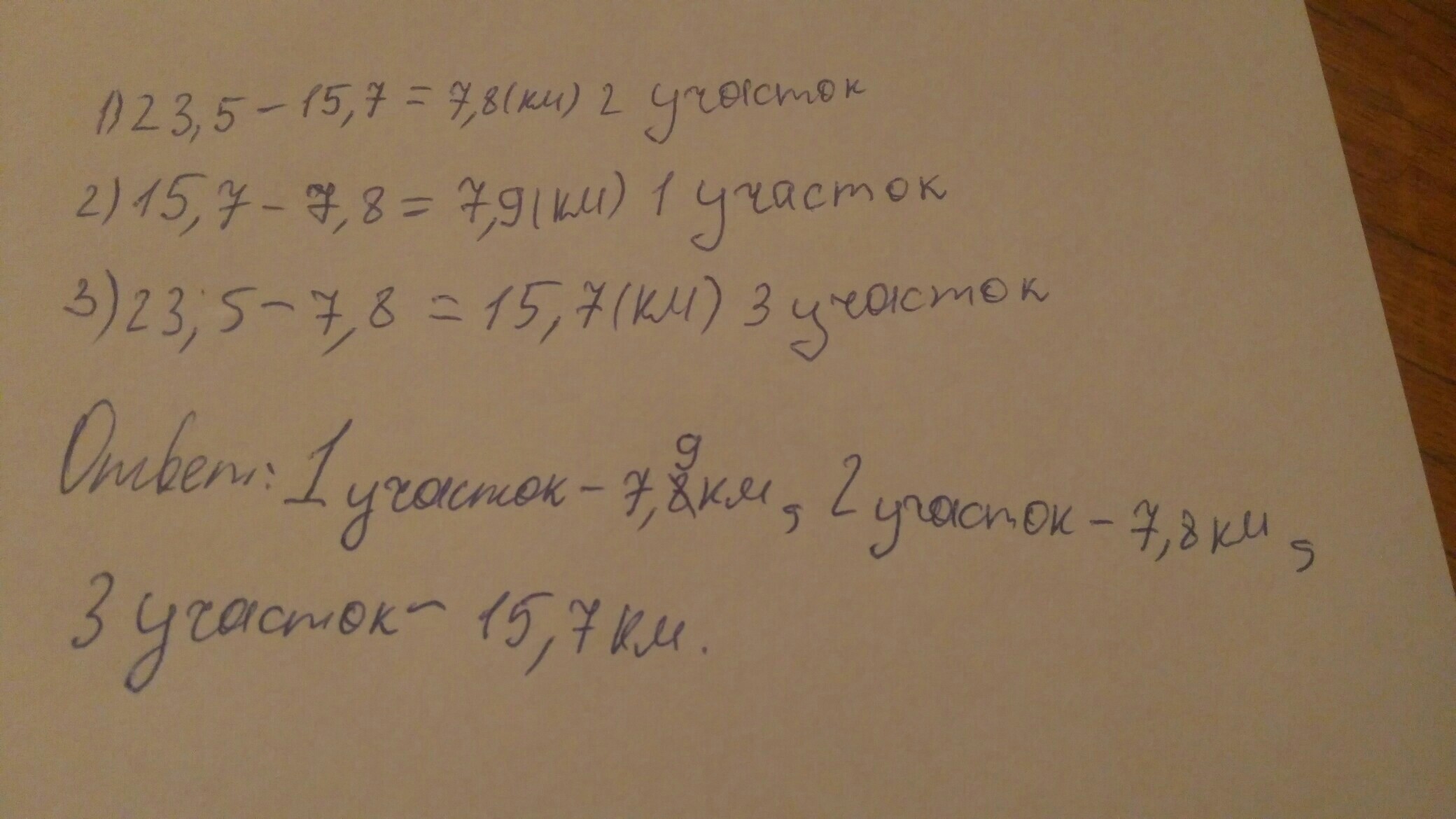 Трасса лыжных соревнований состоит из трёх участков. Длина 1 и 2 участка вместе - 15,7 км,а 2 и 3 участка 23,5км. Какая длина каждого участка