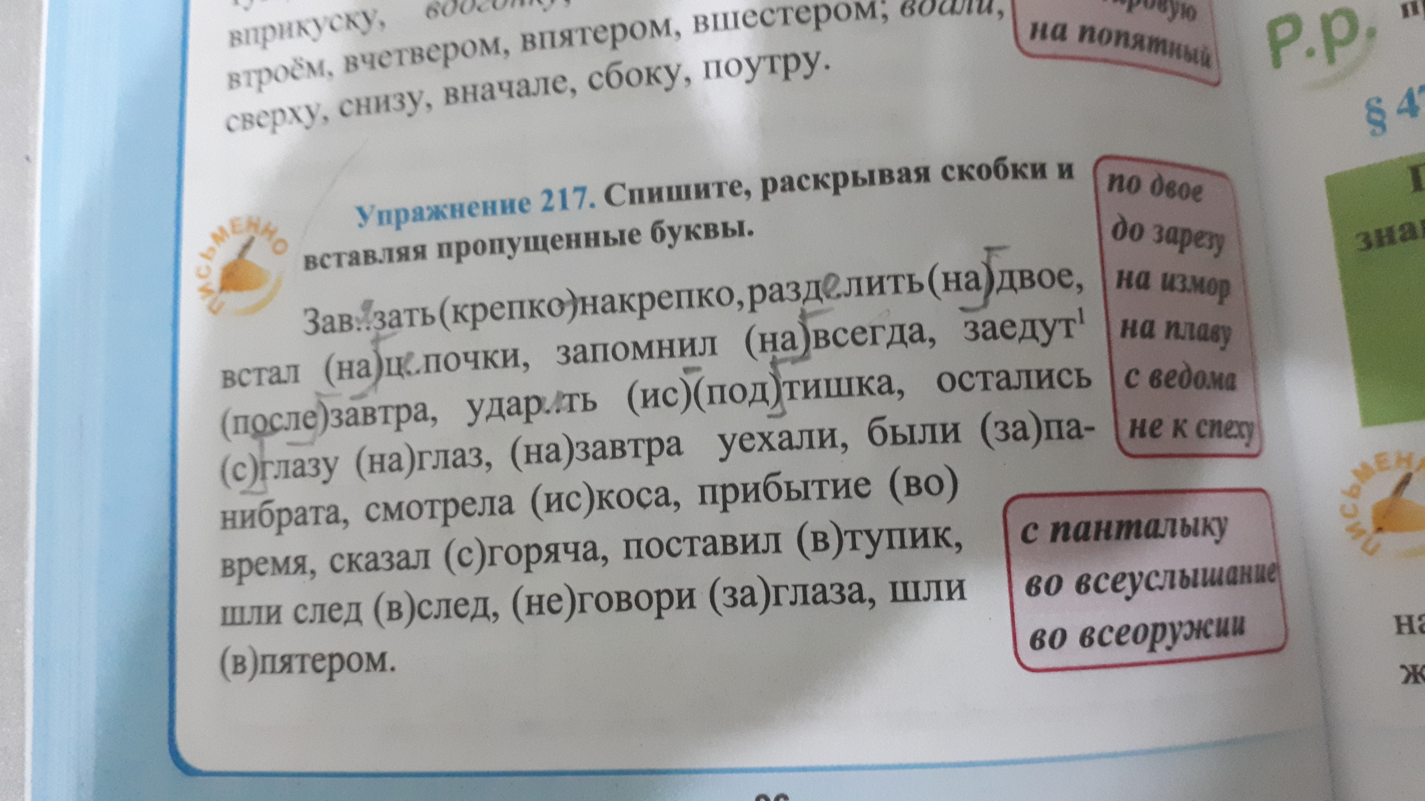 Завязать крепко-накрепко, разделить надвое, встал на цыпочки, запомнил навсегда, заедут послезавтра, ударить исподтишка, остались с глазу на глаз, назавтра уехали, были запанибрата, смотрела искоса, прибытие вовремя, сказал сгоряча, поставил в тупик, шли след в след, не говори за глаза, шли впятером.