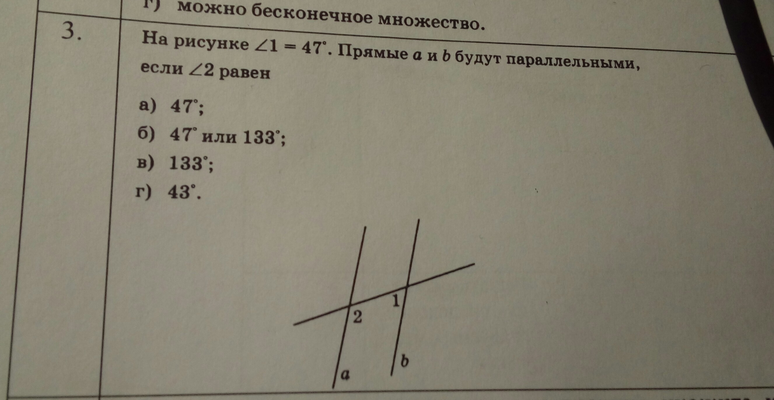 На рисунке угол 1 равен 47 градусов.Прямые а и б будут параллельными,если угол 2 равен