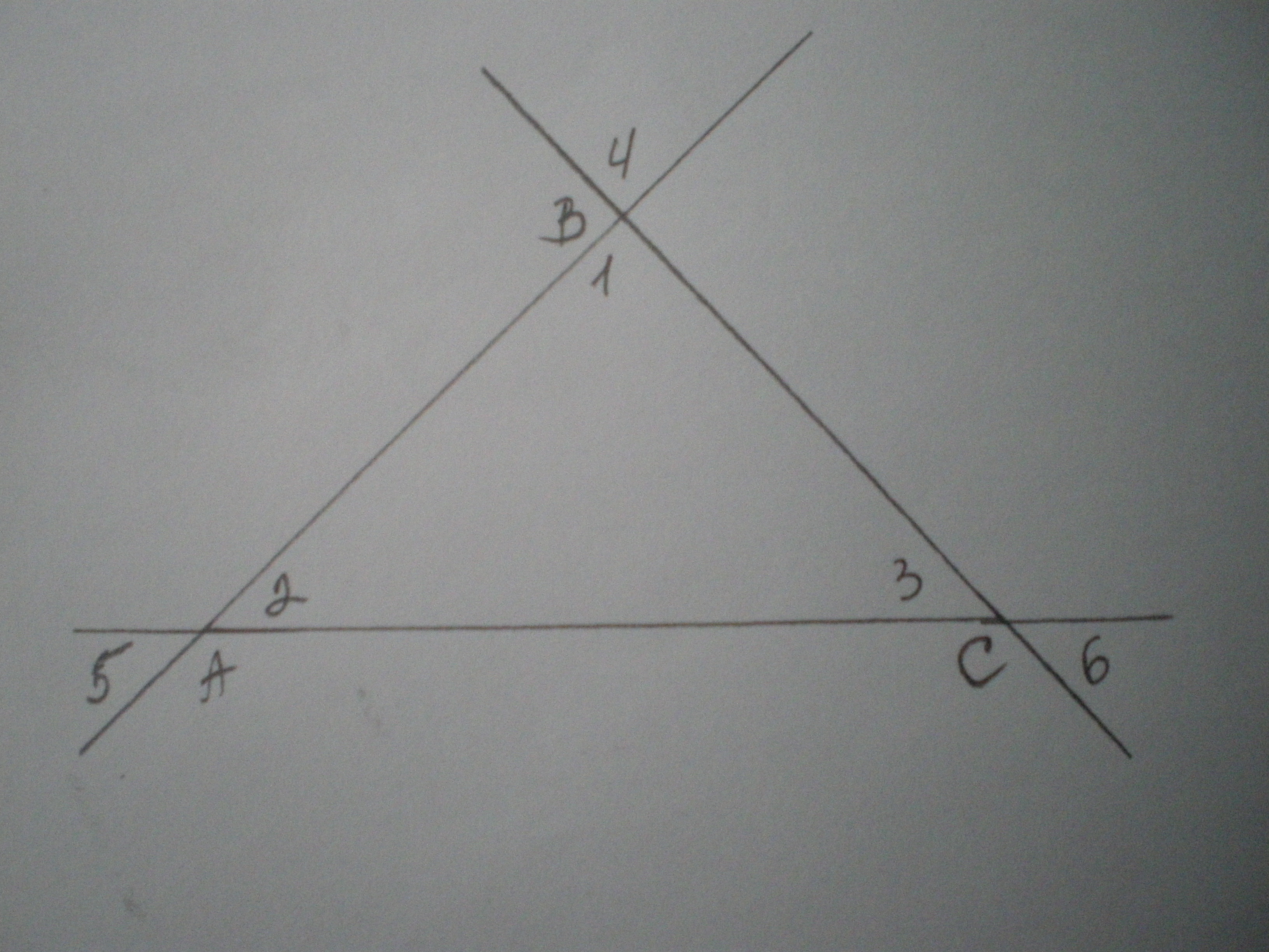 Поэтому: ∠1=∠А+∠С, ∠2=∠С+∠В, ∠3=∠В+∠А.