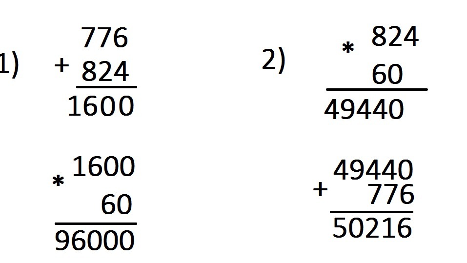 1. Умножение 824*60=49440 2. 49440+1776= 51216