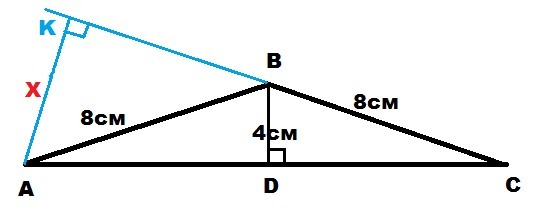 Найдите высоту равнобедренного тупоугольного треугольника с бровями сторонами равными 8 см и меньшей высотой 4 см.