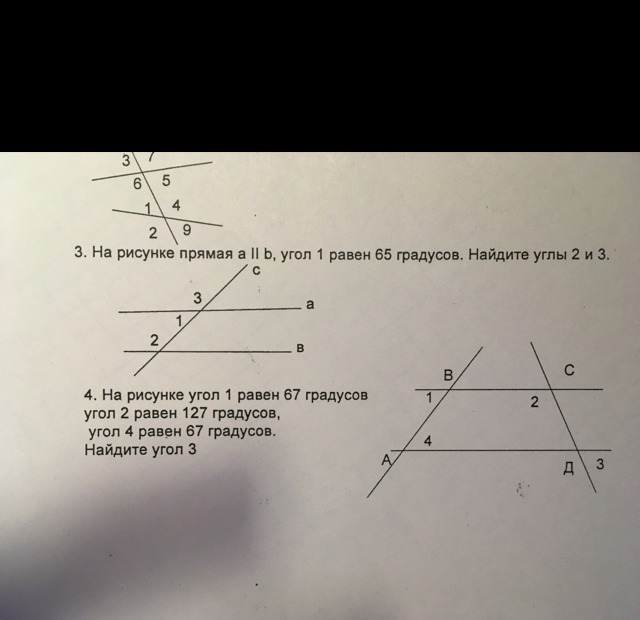 На рисунке угол 1 равен 67 градусов угол 2 равен 127 градусов, угол 4 равен 67 градусов. Найдите угол 3.